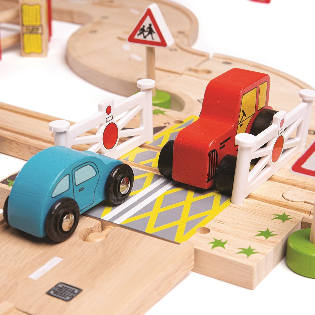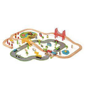 Ez a játékkészlet a fából készült vasúti pálya és a Bigjigs autópálya ideális kombinációja. A vasút természetes közlekedési világunkhoz hasonlóan híd és átkelő segítségével kapcsolódik az utakhoz. A környéket egy helyi tanya, épületek, fák és játékkocsik egészítik ki és szépítik Főbb jellemzők: A Bigjigs Rail vasúti pályák és tartozékaik a piacon lévő összes többi fa vasúti vágányhoz kombinálhatók.
