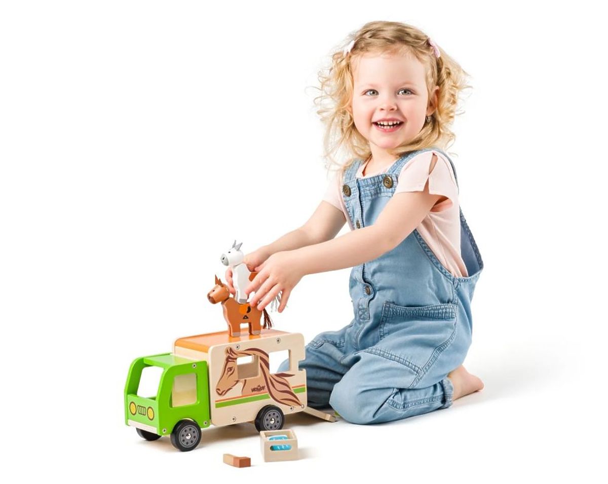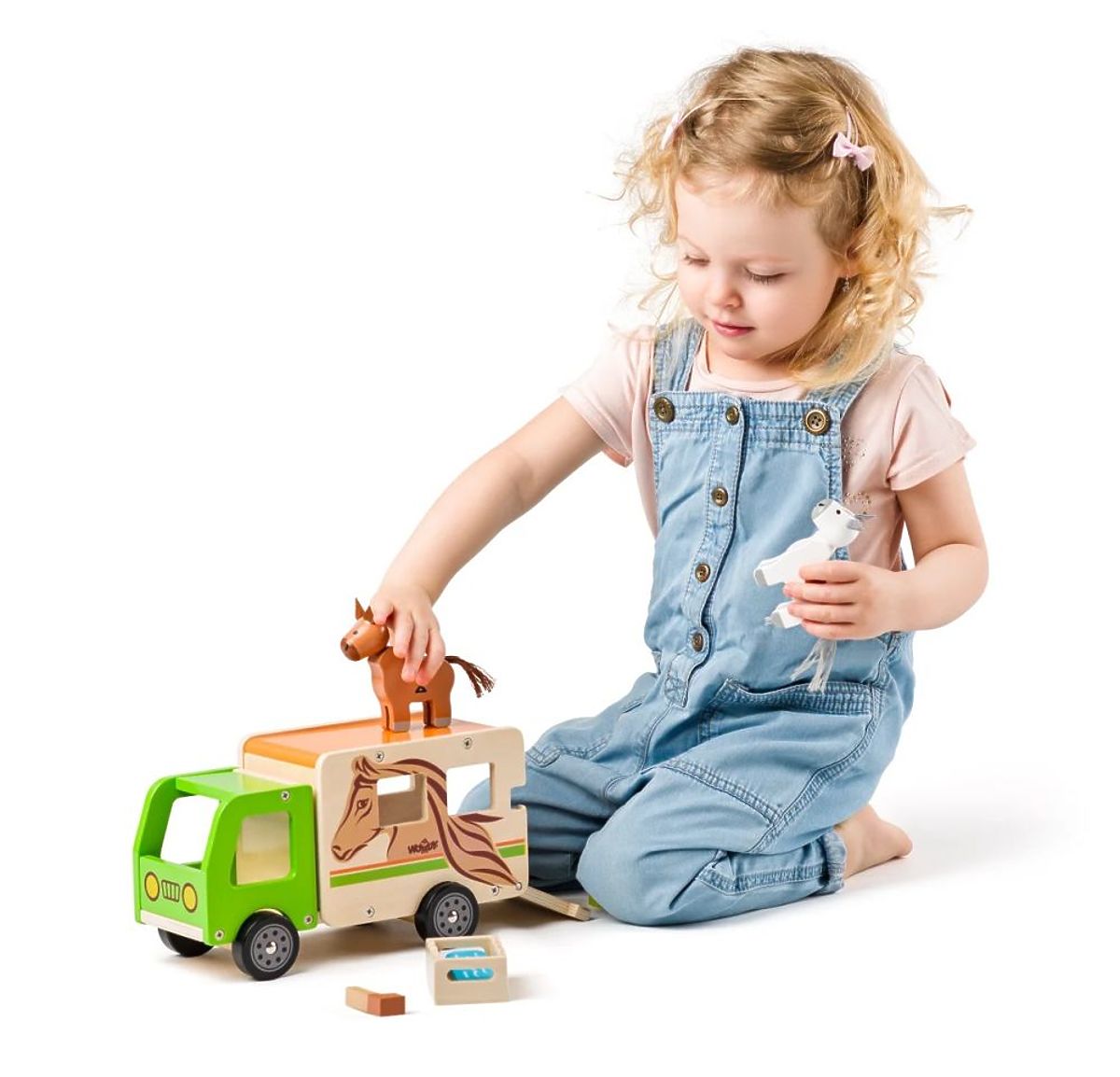 A gyermeke rajong az állatokért, különösen a lovakért? Ha emellett szereti a járműveket is, ez a játék neki való. A lovak szállítására szolgáló teherautó biztonságos játék kisgyermekek számára, amely számos óra fantasztikus szórakozást biztosít. A teherautó hátsó része lehajtható, így egy rámpa alakul ki, amely megkönnyíti a lovak kivezetését, az oldalsó ajtók pedig hozzáférést biztosítanak a gondozóknak. A készlet két fa lófigurát tartalmaz a szükséges kiegészítőkkel és két mozgatható végtagú gondozót.