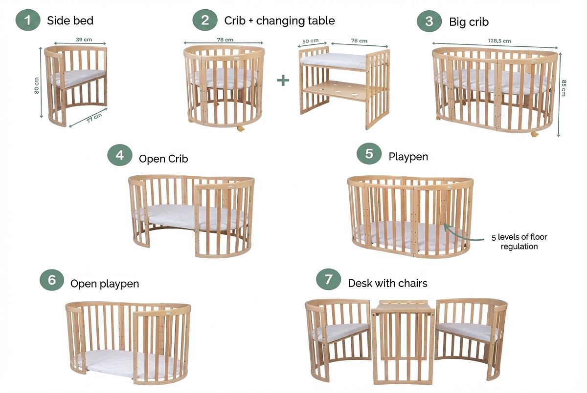 Ez a termesztőágy 7 különböző átalakítási változatot kínál, amelyek tökéletesen megfelelnek a különböző korú gyermekek igényeinek. Az egyik a franciaágy mellé épített kikötőágy nagyon hasznos változata, amelyet különösen értékelni fog a baba életének első heteiben.