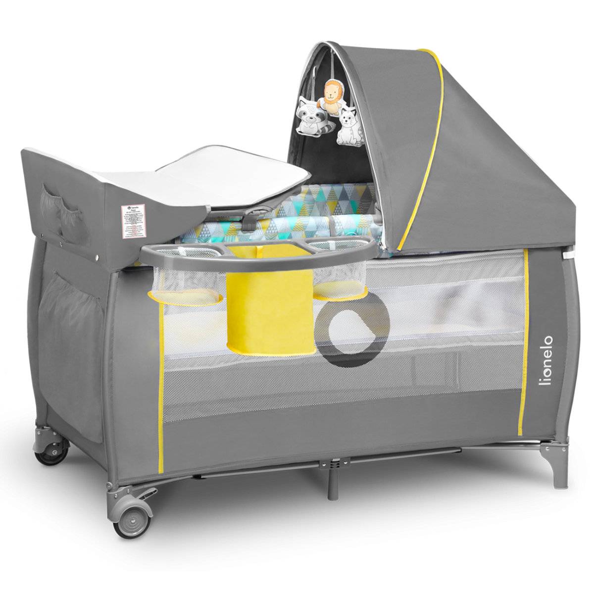 A készlet praktikus része egy pelenkázóasztal 11 kg maximális teherbírással és egy funkcionális oldalzsebbel . A játéképület és az interaktív játszókutya garantáltan örömet okoz a kicsinek.