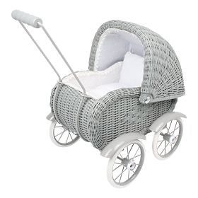 A gyönyörű fonott babakocsi a szürke dekorációval díszített, fényűző dizájnjával kitűnik, akár játéknak, akár dekorációnak.