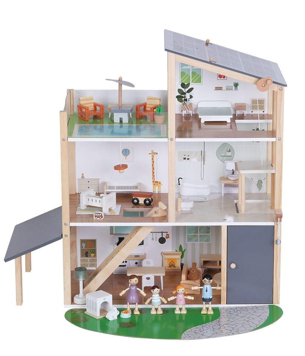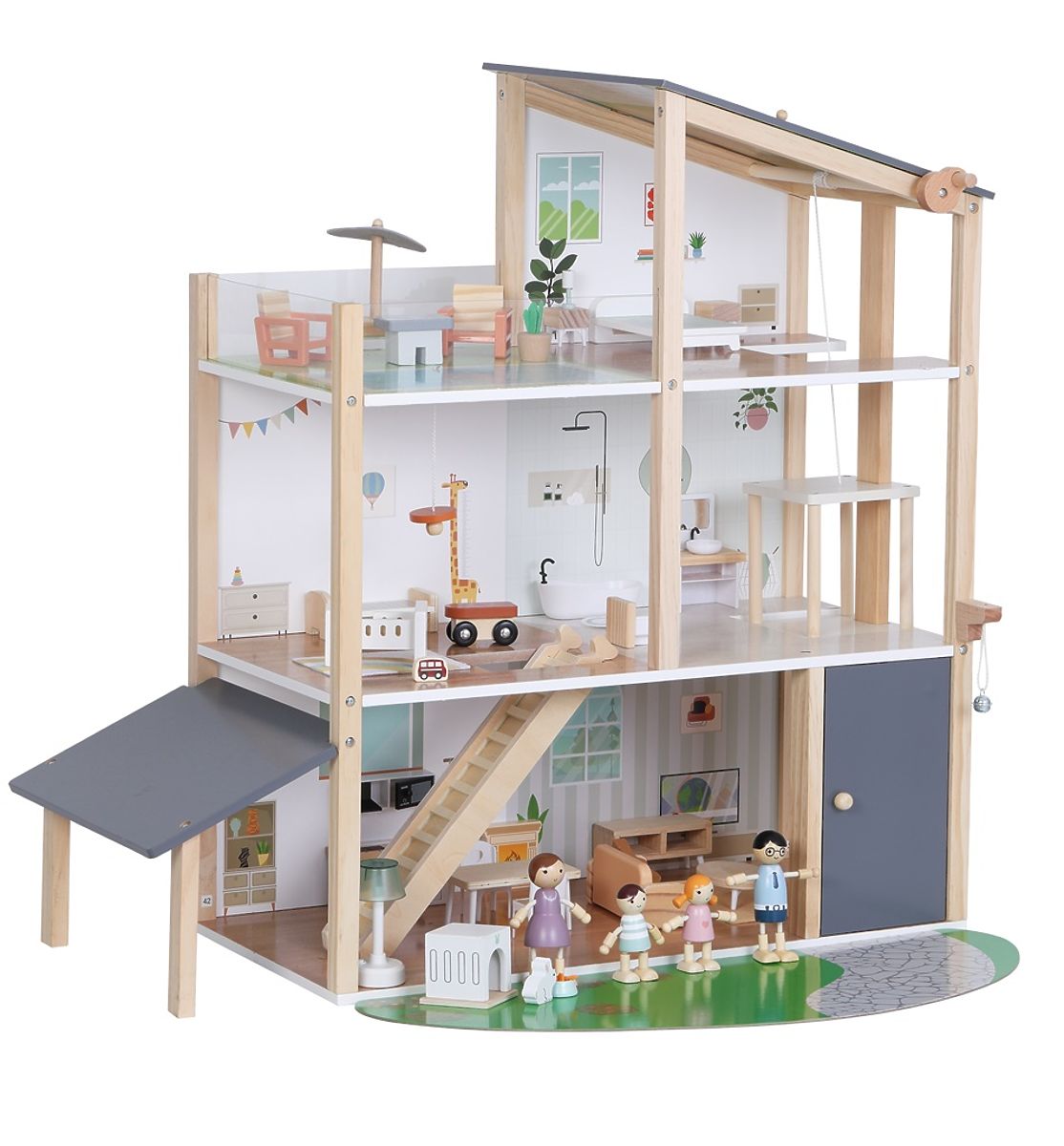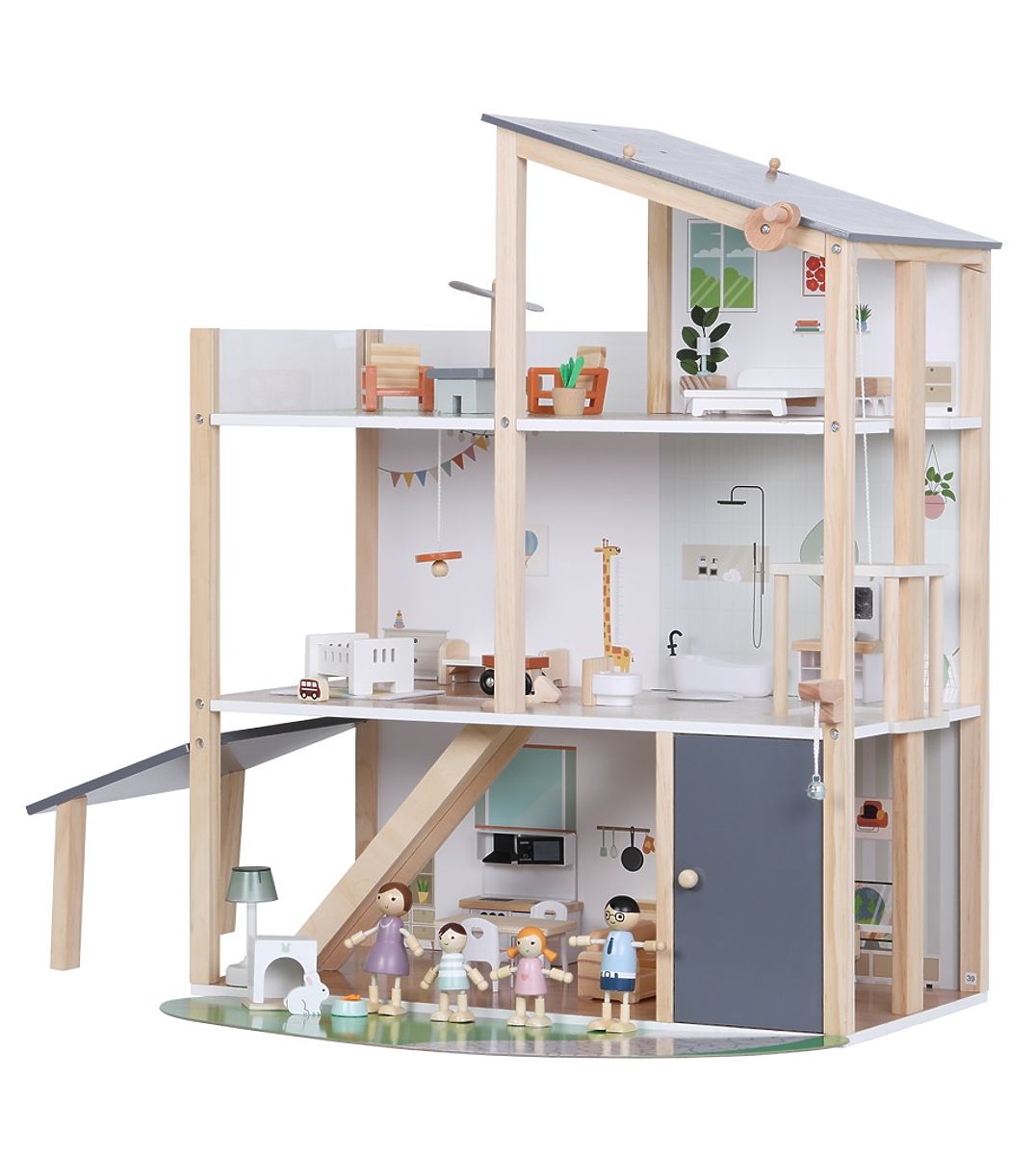 Üdvözöljük a házikóban, ahol az élet öröm! A tágas fa babaház teljesen felszerelt bútorokkal és kiegészítőkkel. Található benne egy tágas konyha, amely összeköttetésben áll egy hangulatos nappalival, egy stílusos fürdőszoba káddal, gyerekszoba, hálószoba és egy luxus tetőterasz a pihenés pillanataihoz. És hogy még több élményt nyújtson, lift is van benne. Forgassa meg a kart, és vigye fel a családot a második emeletre. A készlet része egy aranyos házi kedvenc, egy nyuszi saját házikóval, valamint egy négytagú család, amely készen áll beköltözni és elkezdeni a saját történetét. A gyerekek játék közben fejlesztik fantáziájukat, szociális készségeiket és részletekre való érzéküket. És ami a legfontosabb, remekül szórakoznak! A játékos dizájn, a finom színek és a minőségi kivitelezés minden gyerekszoba vagy játszószoba gyönyörű kiegészítőjévé teszik ezt a játékot. A házikó szétszerelt állapotban kerül szállításra, és összeszerelést igényel. Az összeszerelési útmutató a csomag része. Főbb jellemzők: 41 darab teljesen felszerelt fa babaház 4 családi figurával támogatja a fantáziát, kreativitást és szerepjátékot ösztönöz a képzeletbeli játékra minőségi kidolgozás és vonzó dizájn szétszerelt állapotban szállítva, összeszerelést igényel az összeszerelési útmutató a csomag része 3 éves kortól ajánlott
