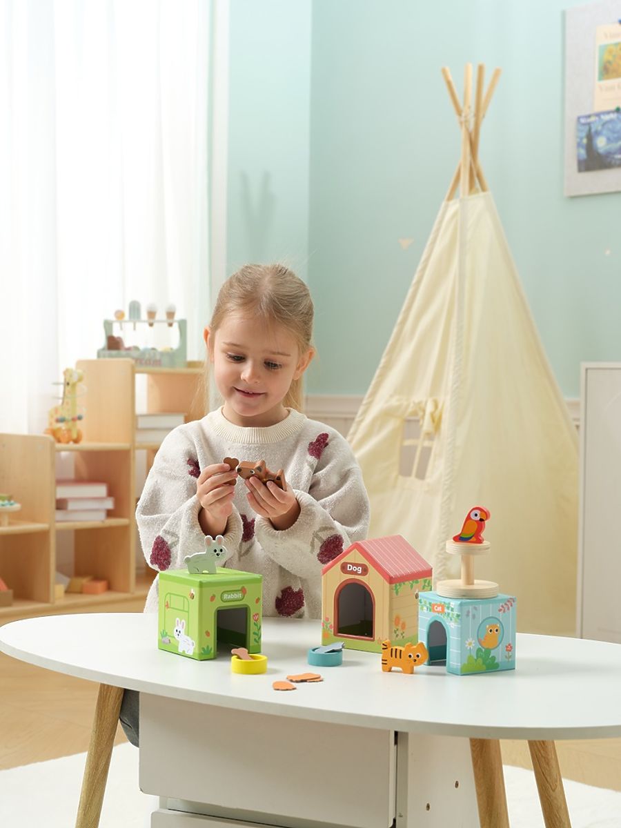 Élvezze a sok szórakozást fa kisállataival! A kutyának, macskának és nyuszinak mind saját házikója és étele van, és egy papagáj figyeli őket a rúdról. A játék .. többet