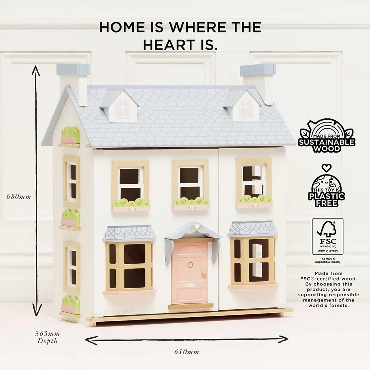 A Mayberry Manor egy luxus, háromszintes, kézzel festett fa babaház. Az egyes szobák különböző díszítéssel rendelkeznek. A ház közepén egy lépcső található. A szobákat válaszfal választja el egymástól. A babaház működő nyitható ablakokkal, zsalugáterekkel és ajtókkal rendelkezik. A ház egyik oldalról nyitható. A tető félig levehető, és előkertként használható, az alsó oldala megfelelően illusztrált. A babaház nagy teret kínál a játékhoz és a kreativitás fejlesztéséhez. A ház 15 cm-es babák számára készült. A babaház bútorai nem tartoznak a csomaghoz, de megvásárolhatók kínálatunkból, akárcsak a babák, kültéri játékelemek, beleértve a játszószőnyeget is. A ház felszerelése nem része a csomagnak. A Le Toy Van babaházakat szeretettel készítik, hogy élethosszig tartó varázslatos játékot nyújtsanak. Fenntartható eljárásokat, etikát alkalmaznak, és gyönyörű fa játékokat készítenek, amelyek ma és a jövő generációi számára is inspirálják és fejlesztik a képzelőerőt. Főbb jellemzők: FSC tanúsítvánnyal rendelkező fából készültsegít a mozgáskoordináció, a szociális készségek és a nyelvi fejlődésbenháromszintes babaház, amely saját kreativitás szerint bútorozhatóhosszú távú képzeletbeli játékot támogatjavítja a koordinációt szórakoztató környezetbenetikusan, fenntartható fából készültgendersemleges dizájn, amely ösztönzi a testvérek közötti megosztástnem mérgező festékekkel díszített, a legszigorúbb szabványok szerint tesztelt Az FSC® (Forest Stewardship Council) márka és tanúsítvány garantálja, hogy a termékhez felhasznált fa nem illegálisan kitermelt, és fenntartható vagy természetközeli módon kezelt erdőkből származik, ahol szigorú környezeti és szociális követelményeknek tesznek eleget. Az FSC® jelzés a terméken azt jelenti, hogy vásárlásával segít megvédeni az erdőket, és támogatja a fenntartható, felelős vagy természetközeli gazdálkodást, amelynek köszönhetően erdeink stabilabbak, egészségesebbek, természetes fajösszetételűek, és jobban ellenállnak az éghajlatváltozás negatív következményeinek.