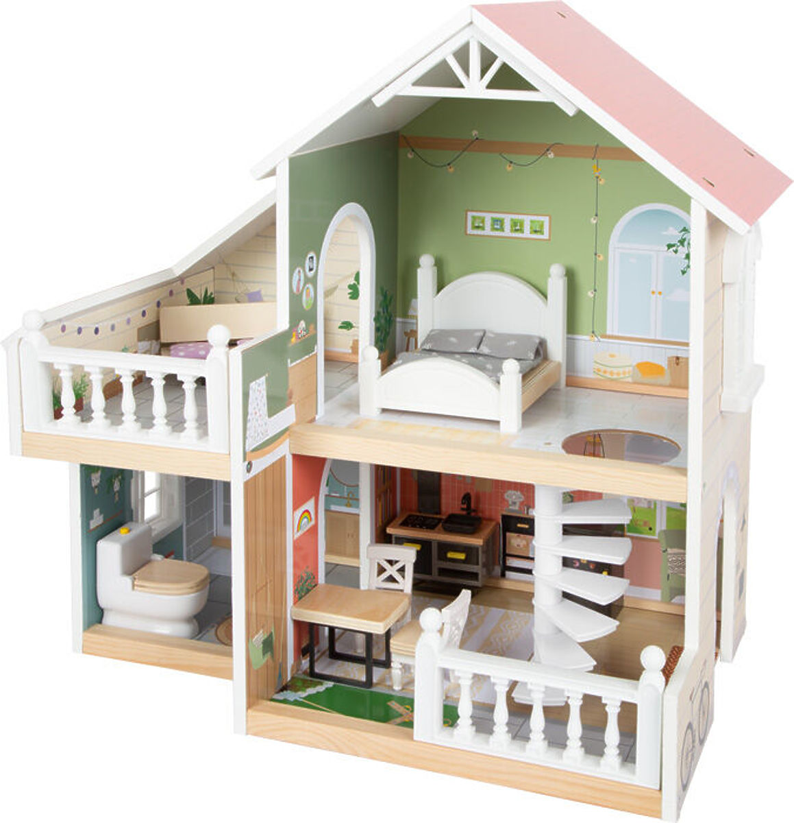 Ez a modern babaház nyitott elülső résszel rendelkezik, gyönyörű művészi részletekkel és modern belső térrel. Kombinált konyha étkezővel, hálószoba, fürdőszoba, valamint egy kis terasz ülőhellyel. Tökéletes játék a gyerekek képzeletbeli játékához. Nyitott lakótér csigalépcsővel, nyitható ablakokkal, modern fürdőszobával a földszinten, plexivel. Található benne 8 db bútor, textil kiegészítők, mint például ágynemű és párnák. Nagy terasz ülőhellyel, nyitható WC, konyhaszekrények és hűtőszekrény ajtókkal, valamint fiókok biztosítják a valósághű játékot. A padok és az ágy textil párnákkal, az ágy pedig paplannal rendelkezik. Ez a babavilla minden nappaliba és gyerekszobába illik, köszönhetően a világos homlokzatnak és a modern színeknek. A nyitott oldal révén egyszerre több gyerek is játszhat vele. Alkalmas 12 cm-es babákhoz. Főbb jellemzők: 3 szoba, terasz, kertfunkcionális műanyag bútor fa részletekkelvilágos külső és modern színsémakompakt és stabil fa babaház sok részlettel kívül-belül2 emelet csigalépcsővel összekötvemodern belső dizájn, nyitható ablakok, plexi zuhanyfal kompatibilis LE11804 figurákkal