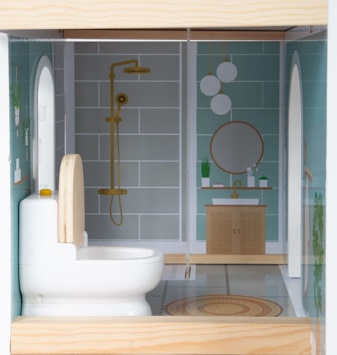 Ez a modern babaház nyitott elülső résszel rendelkezik, gyönyörű művészi részletekkel és modern belső térrel. Kombinált konyha étkezővel, hálószoba, fürdőszoba, .. többet