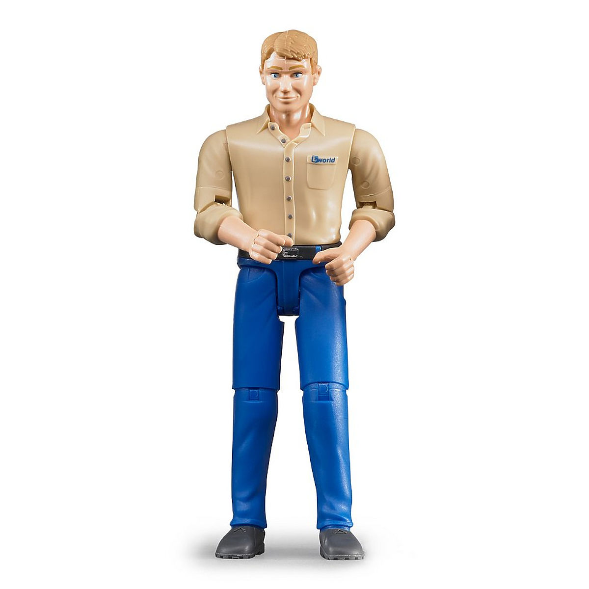Hajlítható végtagokkal rendelkező figura, 10,7 cm magas. Férfi bézs ingben és kék nadrágban. Németországban készült, kiváló minőségű anyagokból. Főbb jellemzők: ízületes férfi figura, Németországban készült