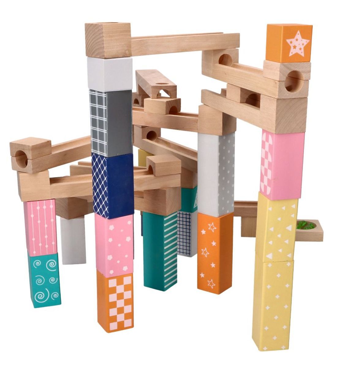 Fantasztikus játék az egész család számára, amely lehetővé teszi, hogy együtt töltsék az időt újabb és újabb konstrukciók építésével. Ebben az esetben az elemek fából készültek, a golyók pedig üvegből, ami garantálja a játék tartósságát. Próbálja ki kreativitását új, gyorsan mozgó golyók számára tervezett pályák kitalálásával.