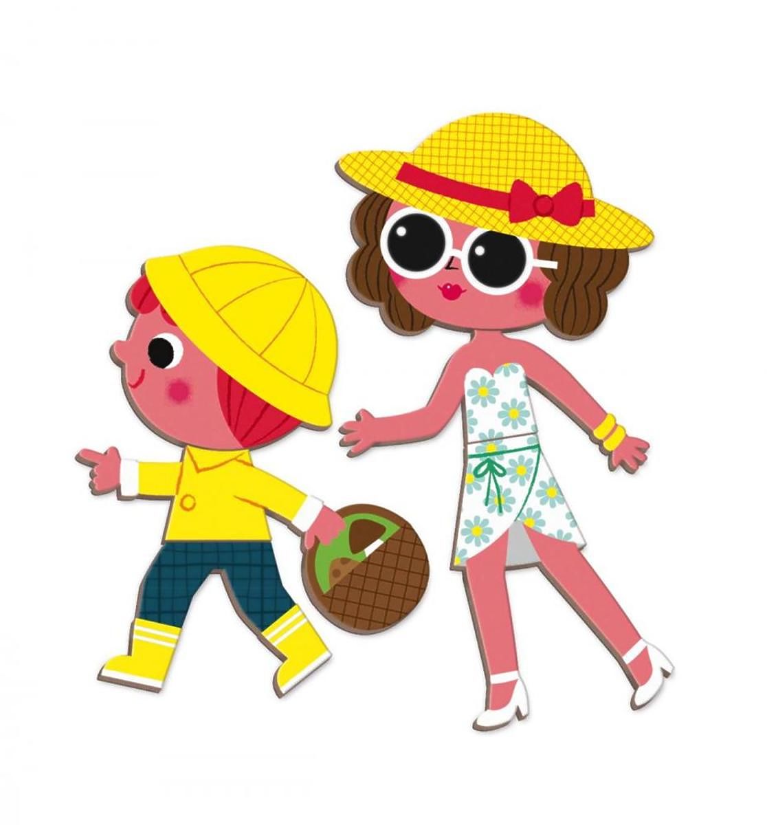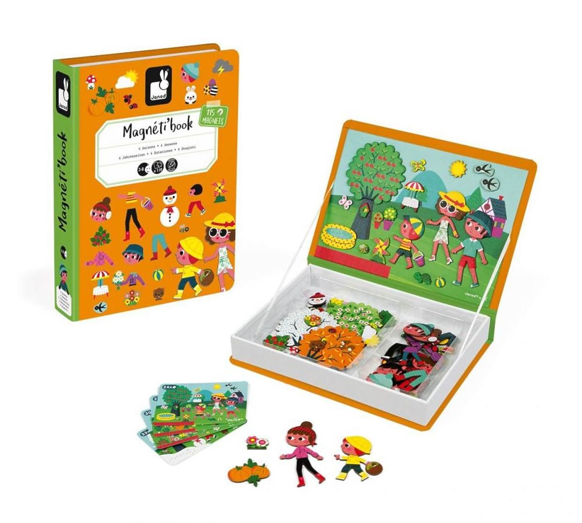 A könyv alakú mágneses puzzle színes motívumokkal rendelkezik, amelyek felkeltik a gyerekek érdeklődését. A kicsik kitalálhatják az évszakokat , és megfelelő ruhákkal és kiegészítőkkel összeállíthatják az adott szezon jelenetét.