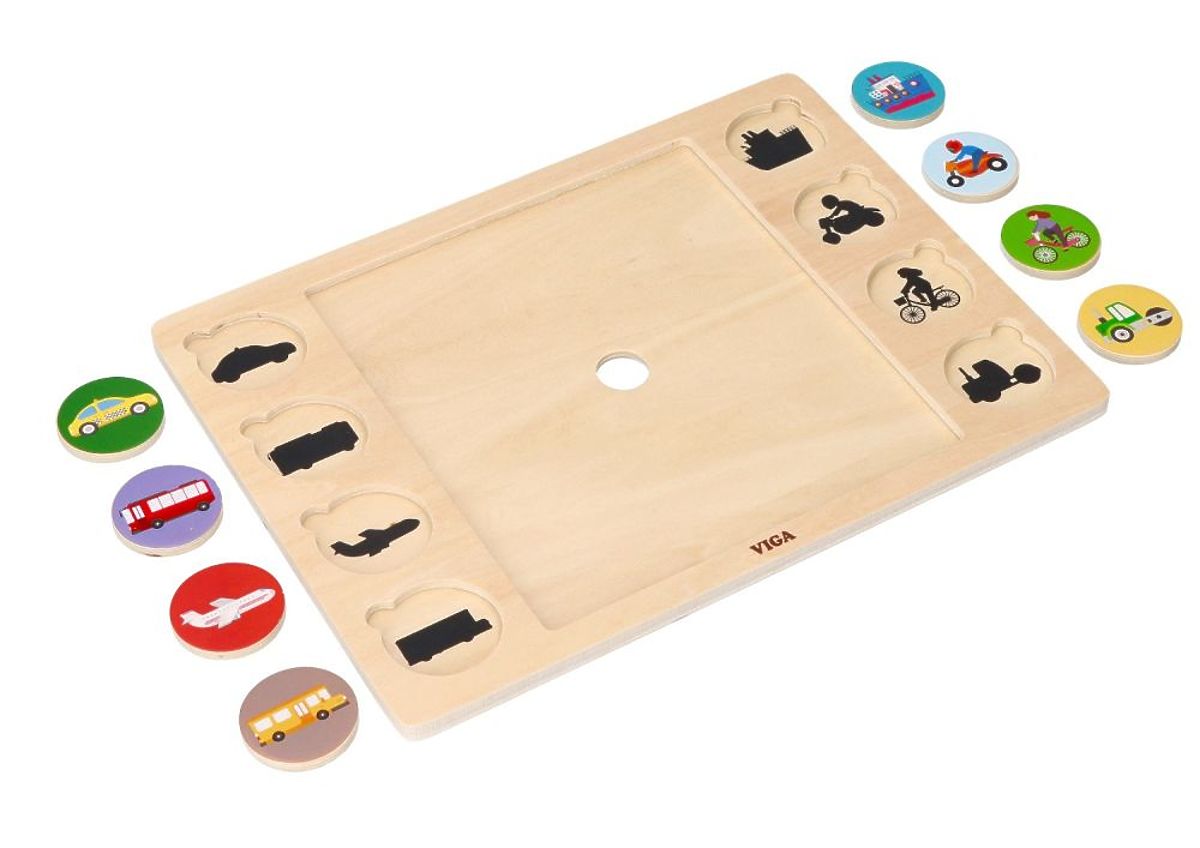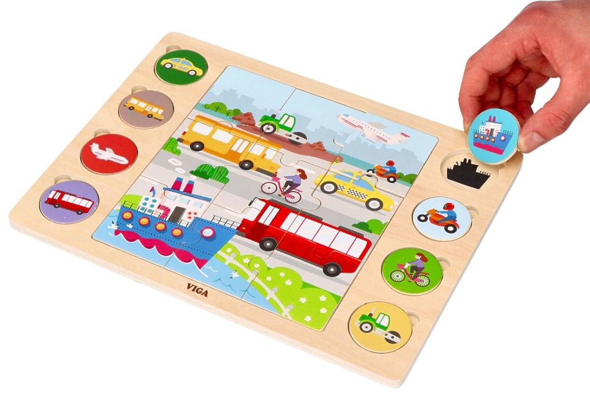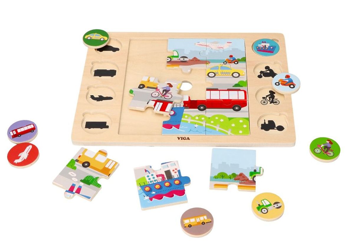 A játék a középen elhelyezett 9 darabos kirakó összerakásával kezdődik. Ezután a gyermek a 8 kerek puzzle-t a táblán lévő megfelelő árnyékokhoz illesztheti. Ez a feladat fejleszti a kézügyességet és a koordinációt, valamint a logikus gondolkodást. Miután az összes elemet helyesen illesztették, a gyermek megnevezheti az egyes járműveket, és megtalálhatja őket a nagy összerakott képen. Ez kiváló módja a szókincs fejlesztésének és a logikus gondolkodási képességek építésének.