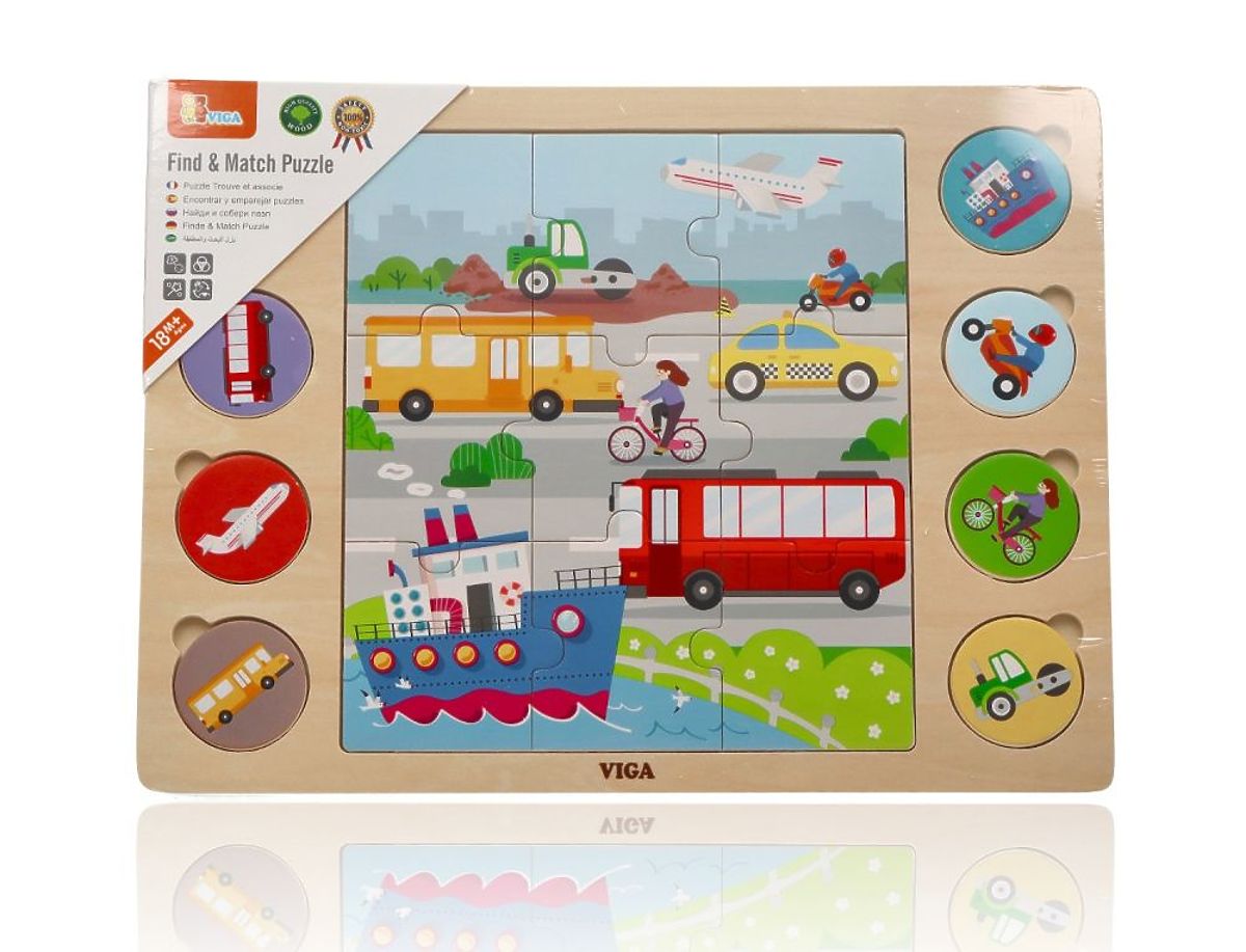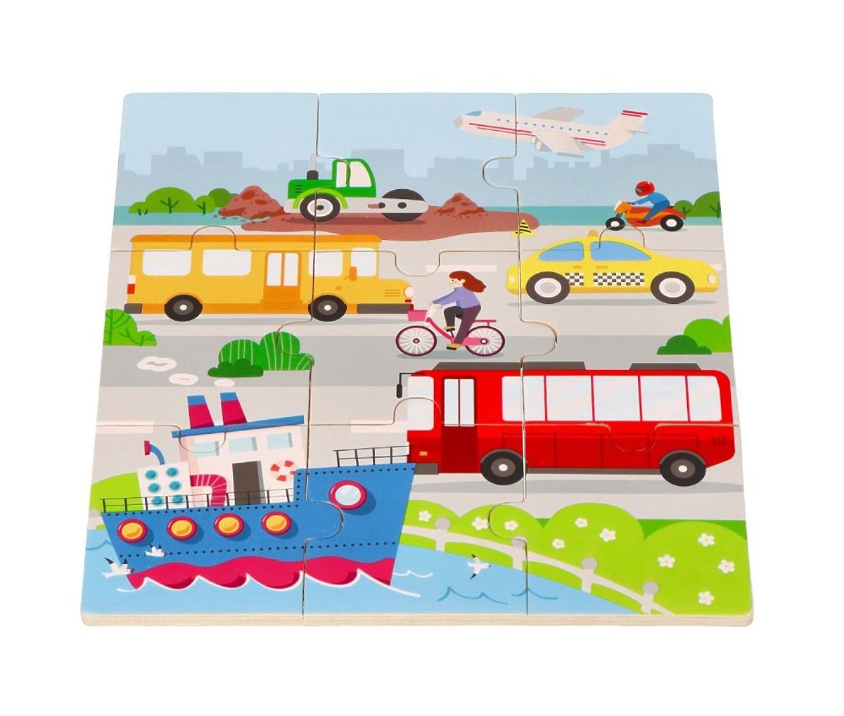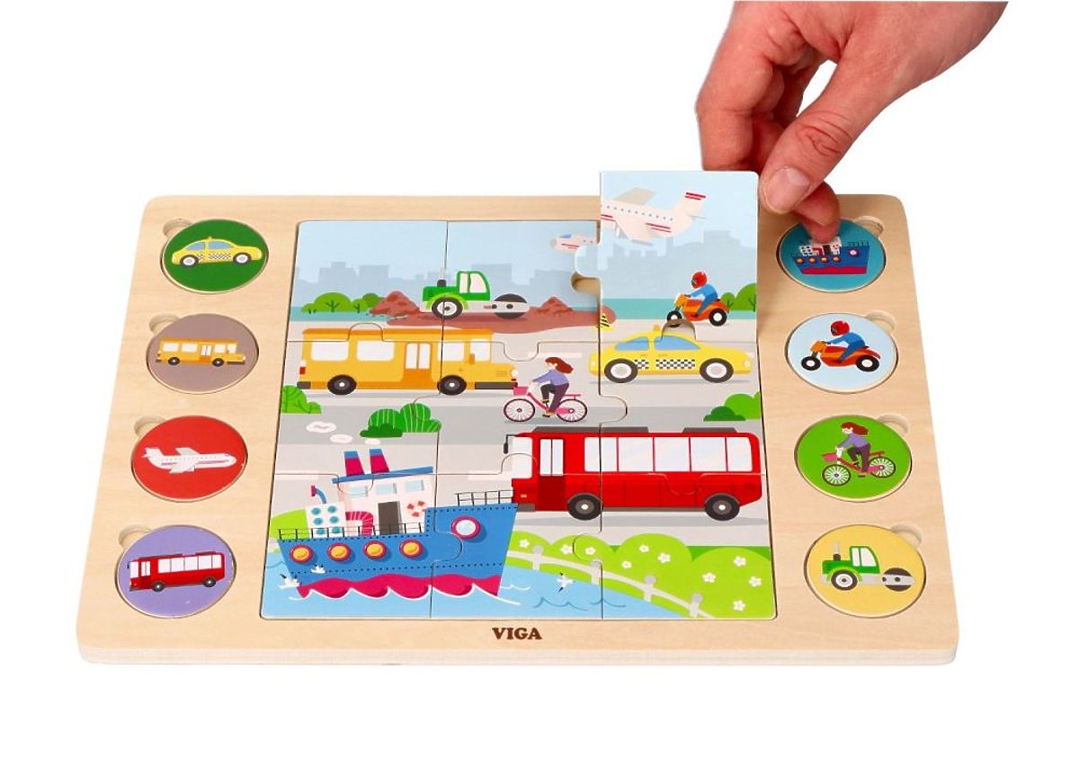A játék a középen elhelyezett 9 darabos kirakó összerakásával kezdődik. Ezután a gyermek a 8 kerek puzzle-t a táblán lévő megfelelő árnyékokhoz illesztheti. Ez a feladat fejleszti a kézügyességet és a koordinációt, valamint a logikus gondolkodást. Miután az összes elemet helyesen illesztették, a gyermek megnevezheti az egyes járműveket, és megtalálhatja őket a nagy összerakott képen. Ez kiváló módja a szókincs fejlesztésének és a logikus gondolkodási képességek építésének.