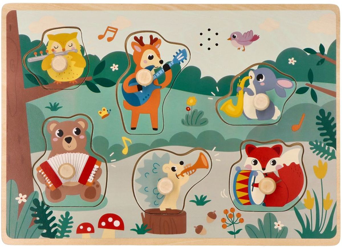 Az Adam Toys újabb hangos kínálata a farm és szafari kirakók mellett. Ezúttal nemcsak az erdei állatokkal ismerkedhetünk meg, hanem különböző hangszerek hangjaival is. A feladat természetesen az, hogy az állatka formáját a kirakón a megfelelő helyre illesszük. Ha ezt helyesen teszi, jutalmul meghallja a hangszer hangját, amelyen az állatka játszik. Ez az oktató játék nagyszerűen fejleszti a gyermek képzelőerejét, tanítja a koncentrációt és a megfigyelőképességet. A gyermek emellett gyakorolja a manuális készségeket, különösen az ujjacskákat, és a hang további játékra ösztönzi.