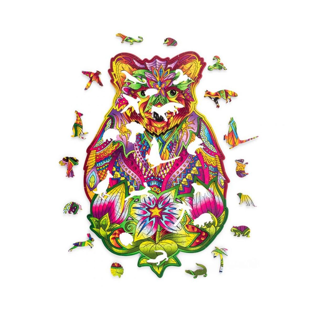 Remek ajándékötlet lesz egy gyönyörű színű, fából készült puzzle egy medve formában. A rejtvények 184 darabból állnak, amelyek egy része más állatok alakja.