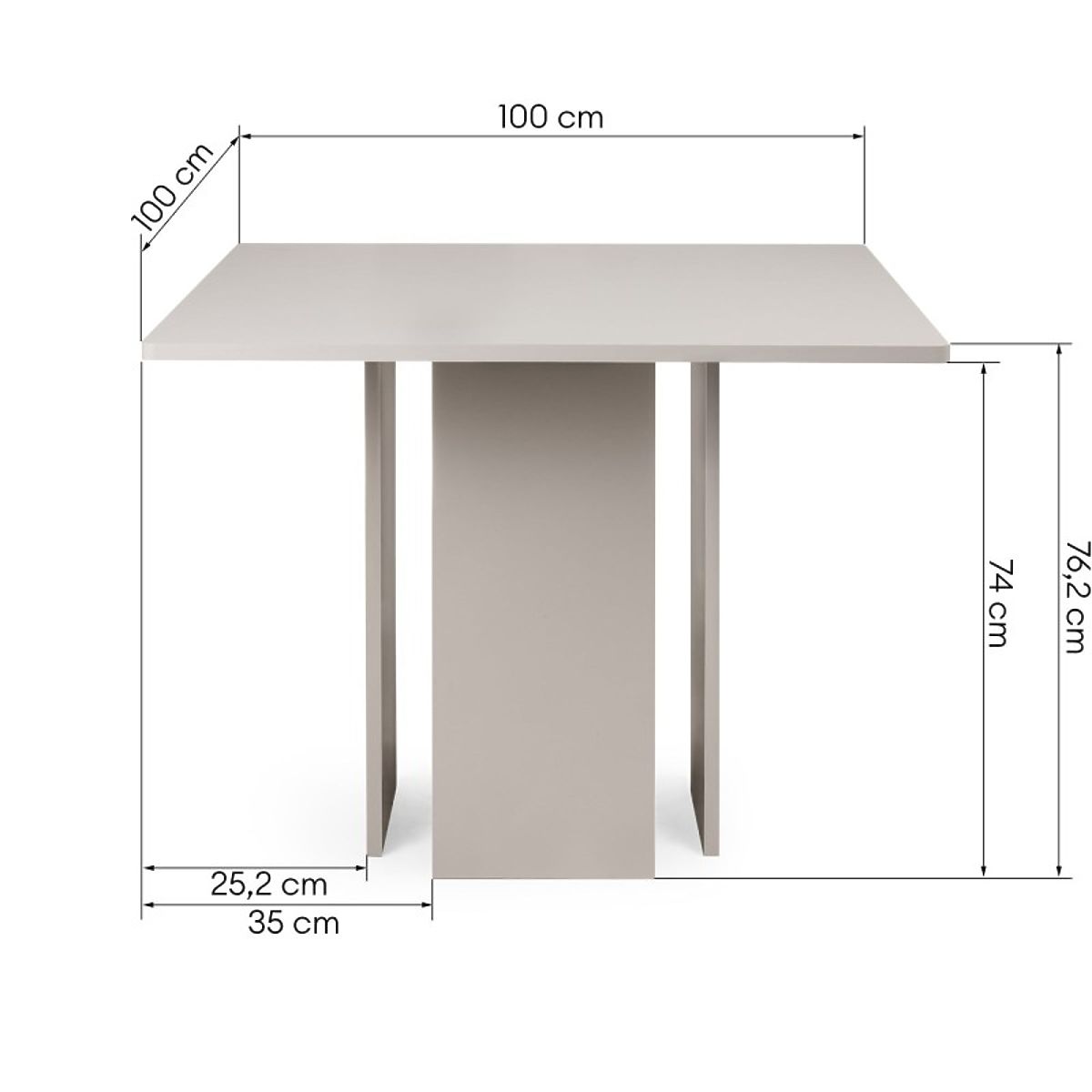A Gasper étkezőasztal 100 × 100 cm-es méretben, kasmír színben modern bútor, amely remekül illik a konyhába, étkezőbe vagy nappaliba. A négyzet alakú asztallap kényelmes helyet biztosít négy személy számára, így az asztal ideális lakásokba és kisebb terekbe.