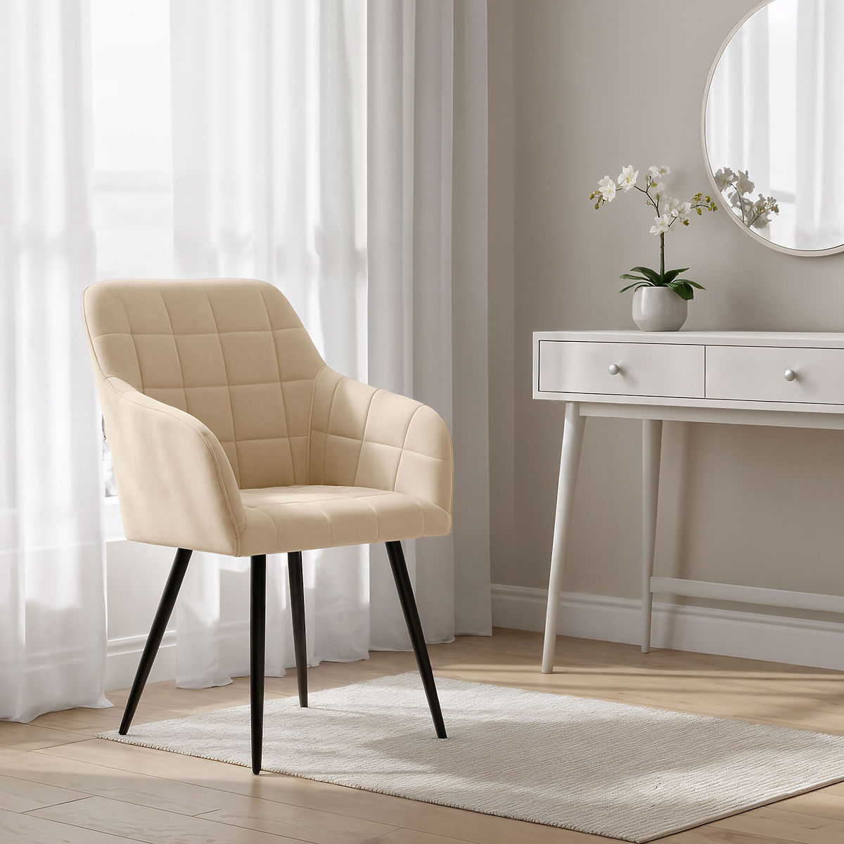 Bézs kárpitozott székek négyzetes tűzéssel és fekete lábakkal. .. többet
