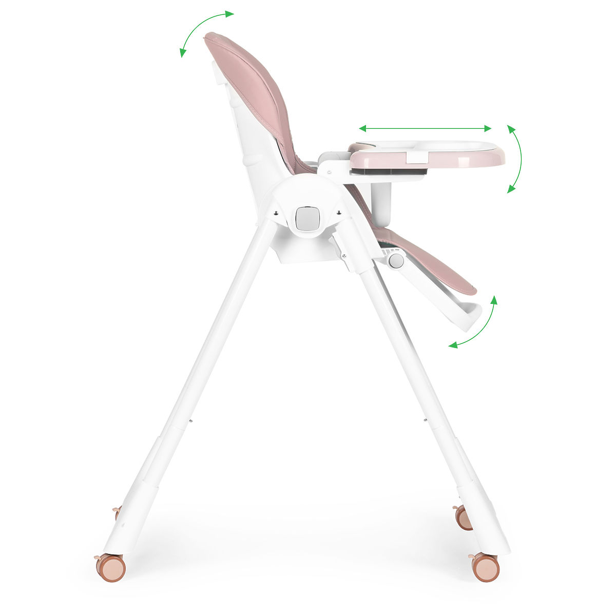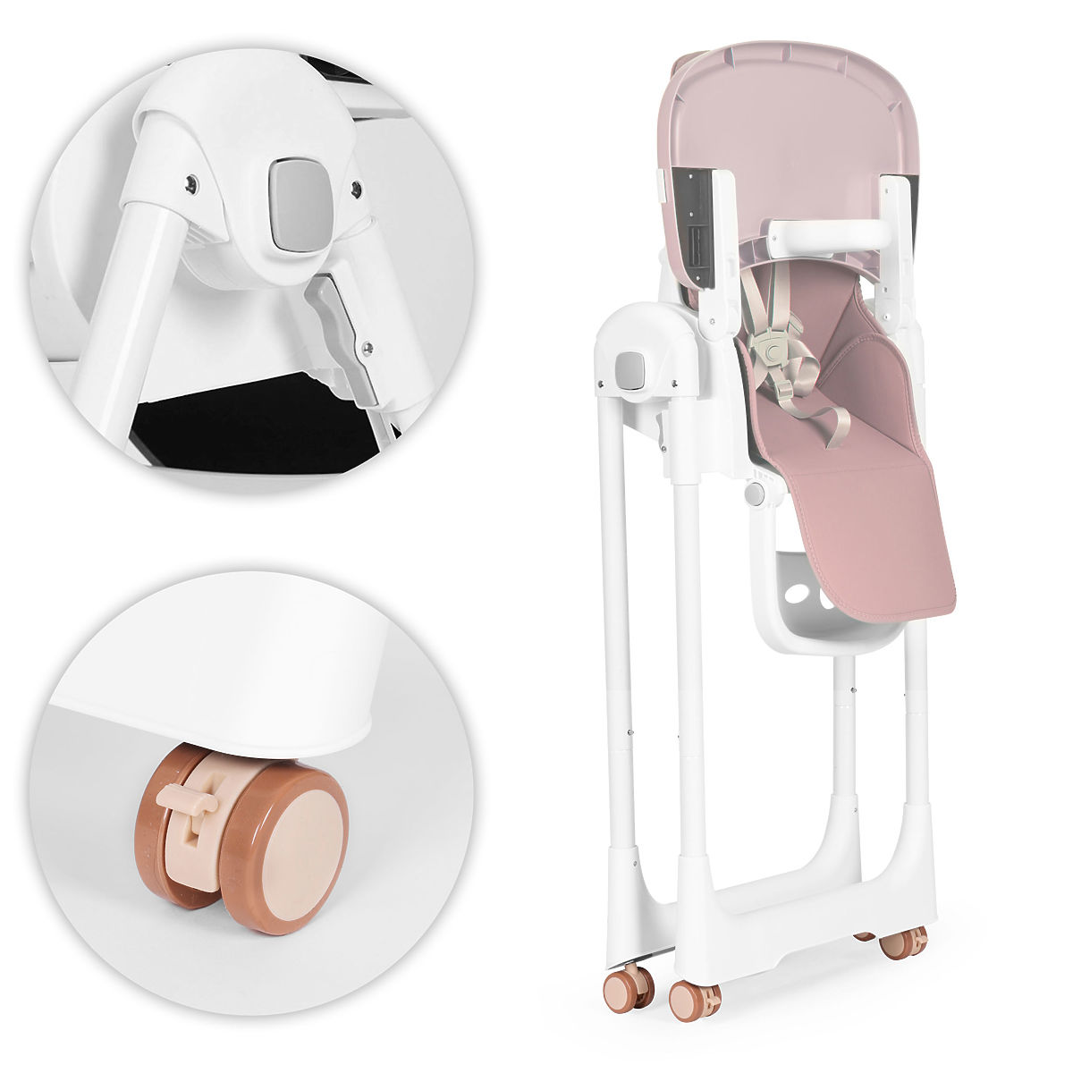 BIZTONSÁGOS KEREKEKAz etetőszék lábai kerekekkel vannak ellátva, amelyek blokkoló elemmel rendelkeznek a forgásukhoz, egy mozdulattal blokkolhatja őket, és hatékonyan rögzítheti az egész szerkezetet. A kerekek megkönnyítik az etetőszék áthelyezését a kívánt helyre, és gumiborításuk megvédi a padlót a karcolásoktól.