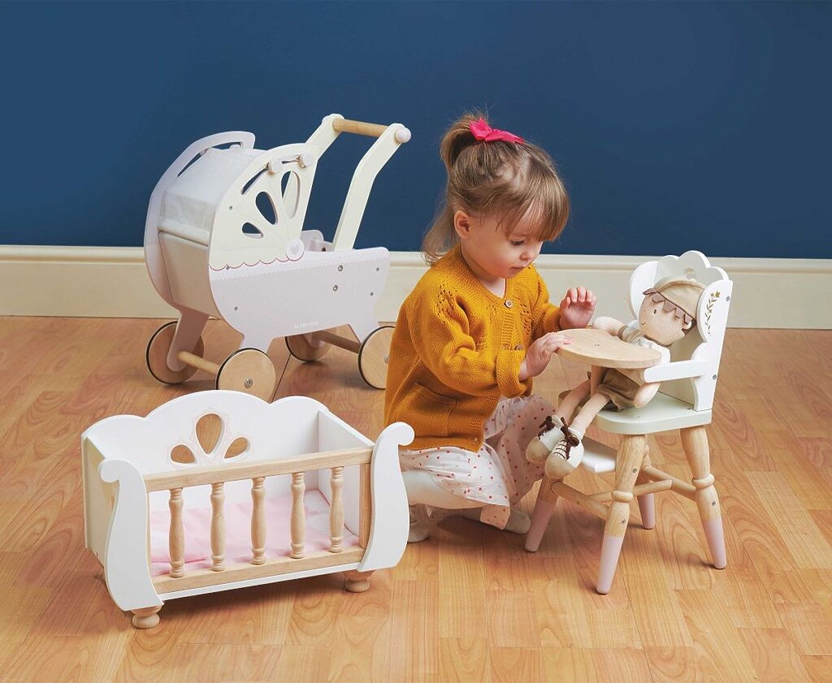 Gyönyörű fa etetőszék, tökéletes szerepjátékhoz! Alkalmas körülbelül 35 cm-es plüssállatokhoz és babákhoz, fiatal anyukákat és apukákat képzeletbeli játékra inspirál. Tartós és fenntartható gumifából készült, nincs benne műanyag, igazi öko szórakozás! A szék számos részlettel rendelkezik, díszes lábak, dizájnos kivágások a háttámlán, arany virágdíszítés. Praktikus felszereltsége közé tartozik a lábtartó és a tálca. Igazán élethű etetőszék az éhes játékok számára. Az etetőszékhez szépen illik a Sleigh kiságy és a Sweet Dreams babakocsi, amelyeket a „kiegészítők” fül alatt talál. Játékok céllal: Minden Le Toy Van játék tartósra készült. Szeretettel tervezett, tapasztalt kézművesek által, etikus gyakorlatok és fenntartható anyagok felhasználásával, amelyek kíméletesebbek bolygónkhoz. Főbb jellemzők: babaszék, alkalmas 30-35 cm-es játékokhoz, etikus fenntartható fából készült, nem tartalmaz műanyagot, a legszigorúbb szabványok szerint tesztelt, nem mérgező vízbázisú festékekkel festett, képzeletbeli játékra inspirál, segíti a szociális készségek és a beszéd fejlesztését, összeszerelést igényel a használati útmutató alapján. Játék díjak: Good Toy Guide Ajánlott. Honeybake kollekció: A kollekció játékai felfedezésre alkalmasak, segítik a gyerekeket a képzelet, a szociális és verbális készségek, valamint a kognitív funkciók fejlesztésében. A hagyományos dizájn modern részletekkel biztosan szórakoztató lesz a gyerekek számára. A Honeybake a Le Toy Van kollekciója, amely a legtöbb díjat nyerte el a dizájn, minőség, biztonság, valamint az oktatási és játékérték miatt.