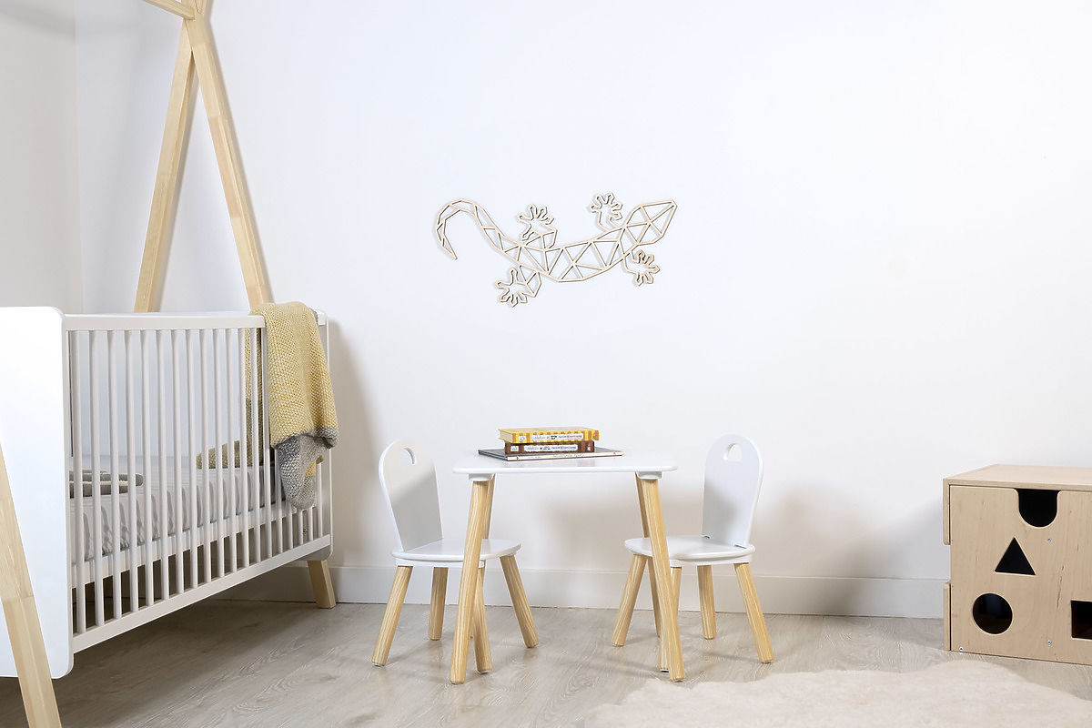 Fából készült geometrikus figura gyík formájában. A függő rétegelt lemez dekoráció alkalmas skandináv stílusú gyerekszobába.