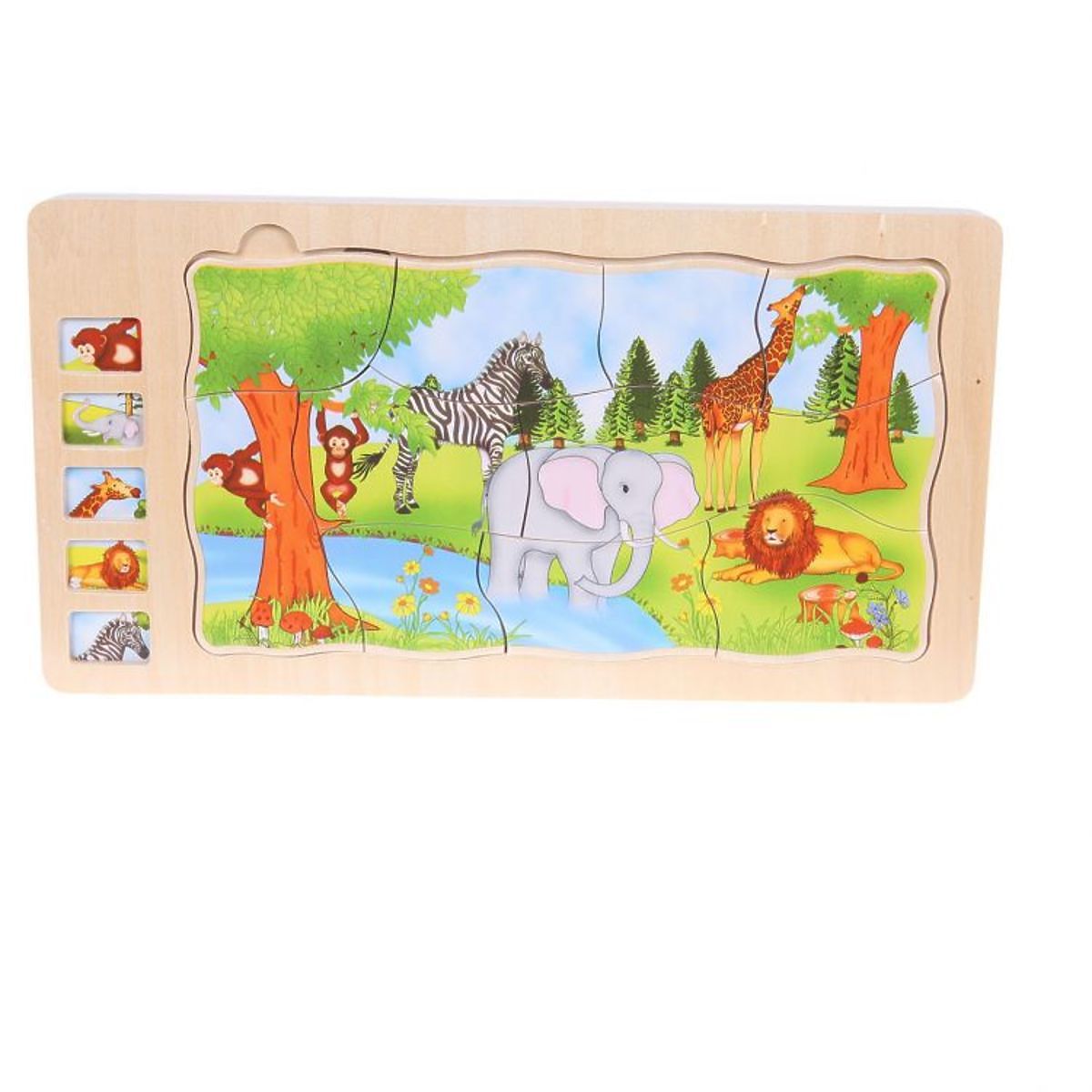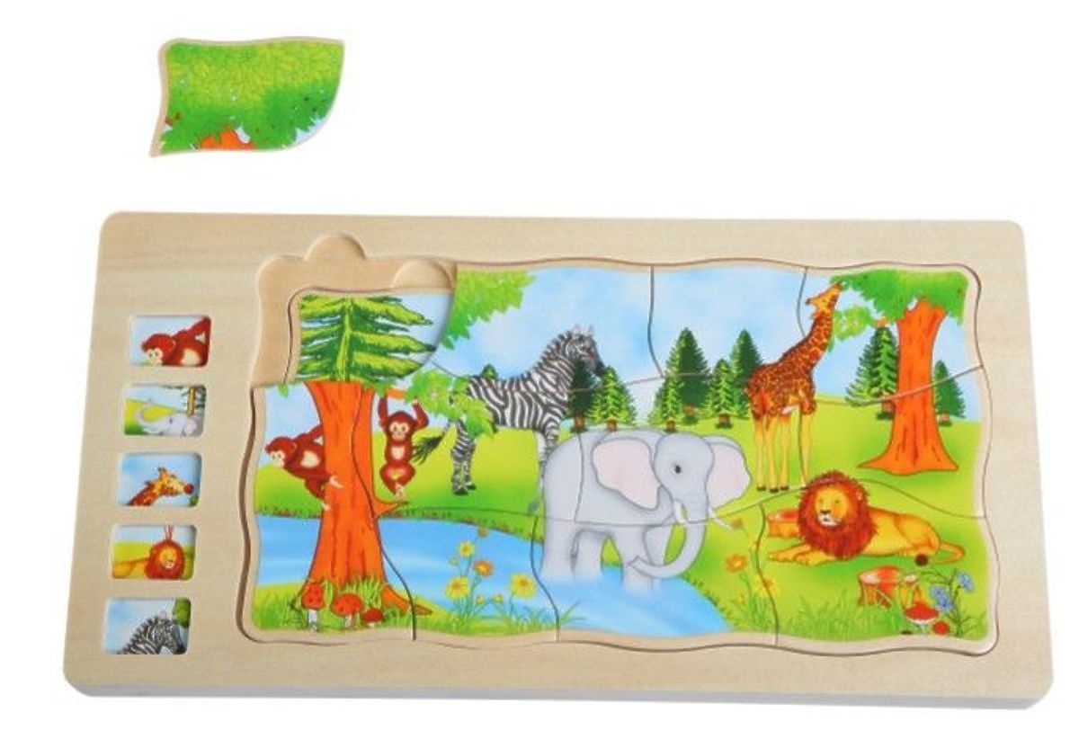 A puzzle dzsungel mintával nagyon modern, szép, színes és praktikus. Bárhová magával viheti, az utakon vagy nyaraláskor is remekül leköti gyermekét. A puzzle kizárólag a legjobb minőségű fából készült. Az élei le vannak kerekítve, így kiküszöbölhető az esetleges sérülések. A gyerekek számára a szórakozás garantált hosszú időre. Ennek a puzzlenak köszönhetően gyermeke fejleszti a kézügyességt, a markolását és gyakorlolja logikájét.