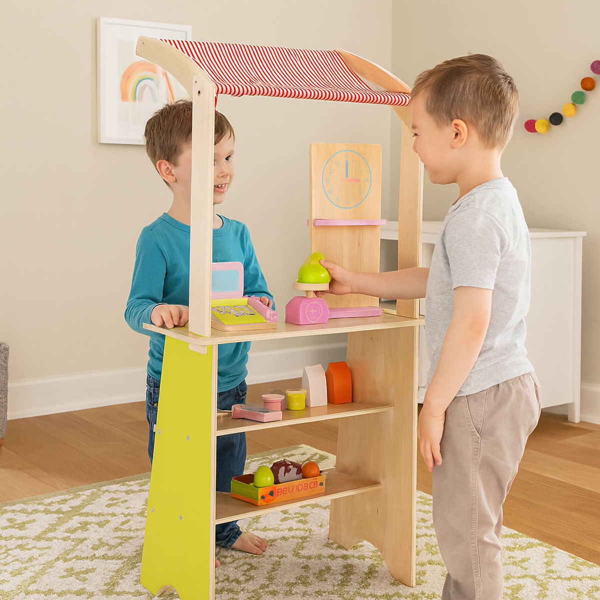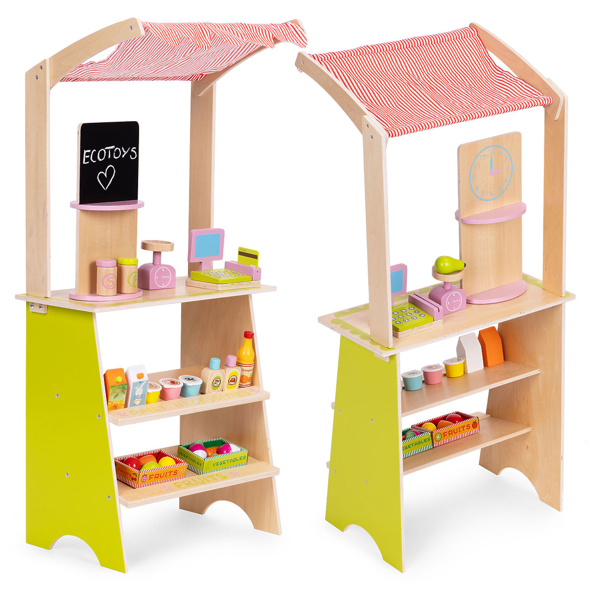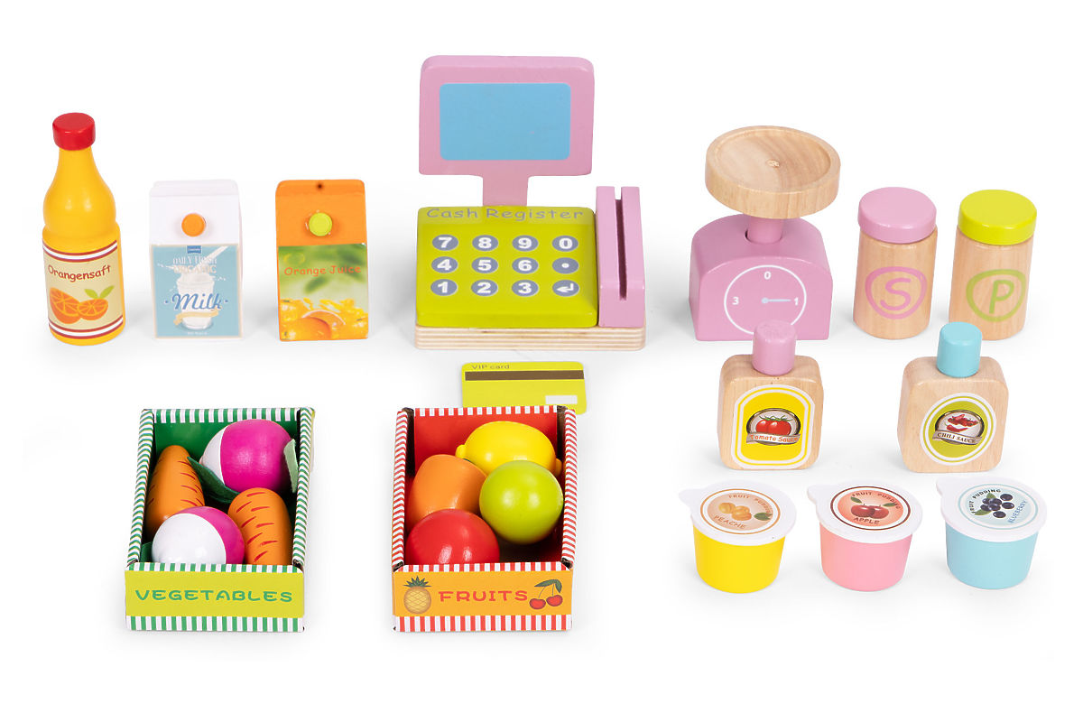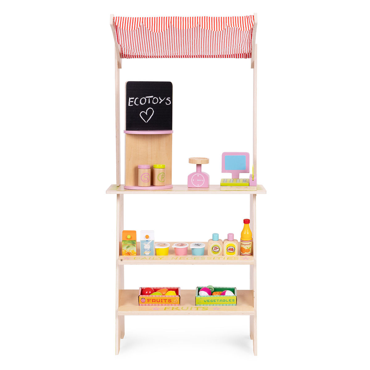 Az ECOTOYS fa stand ösztönzi a gyerekeket az aktív szerepjátékra, tanítja az alapvető szociális viselkedést, mint a vásárlás, eladás és számolás. A játék ideális otthonra, óvodába vagy játszószobába. Nagyszerű eszköz az együttműködés, kommunikáció és kreatív gondolkodás tanulásához. A pénztárgép, terminál, mérleg és számos élelmiszer jelenléte révén a játék valósághűvé és egyben vonzóvá válik. A termék fejleszti a kéz-szem koordinációt, serkenti a képzeletet és ösztönzi a gyermeket az önálló cselekvésre.