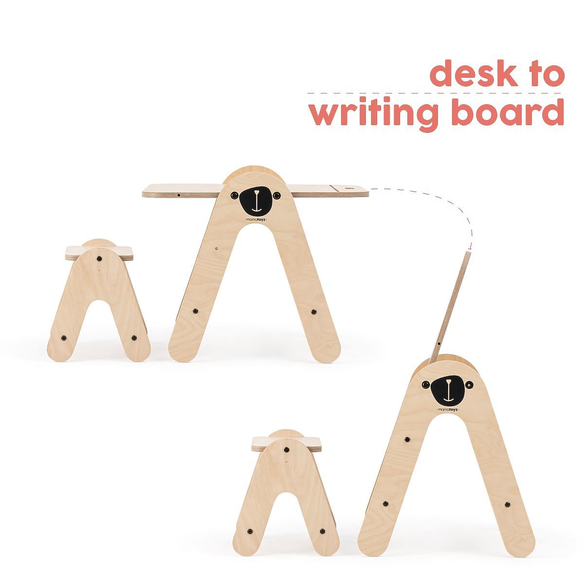 Praktikus asztal székkel, amely egy pillanat alatt rajztáblává alakítható. Az asztal rendelkezik egy fa rúddal is a papírtekercs számára, amely az asztal lábaihoz van rögzítve. Gyermeke így bátran alkothat kreatív rajzokat.