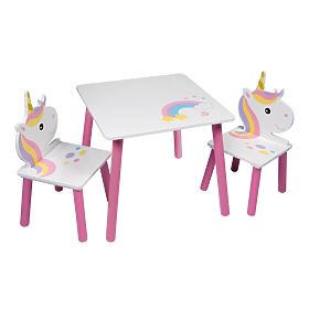 Fából készült asztal és székek népszerű egyszarvú motívummal. Tökéletes helyet biztosít gyermekének játékra és pihenésre is.
