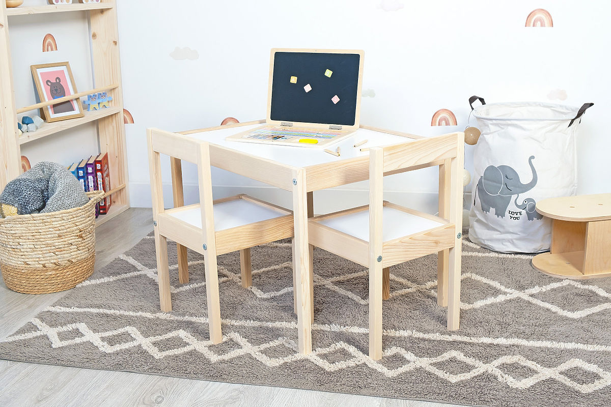 Egy gyerekasztal és 2 szék készlet nem hiányozhat egyetlen gyerekszobából sem. Ez a minimalista stílusú szett könnyen alkalmazkodik bármilyen környezethez, és .. többet