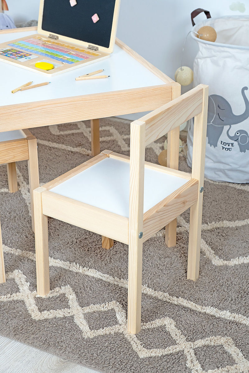 Ez a minimalista stílusú szett könnyen alkalmazkodik bármilyen környezethez, és alkalmas lesz gyerekszobába és játszószobába is. Ez egy rendkívül strapabíró asztal és szék szett kiváló minőségű fenyőfából.