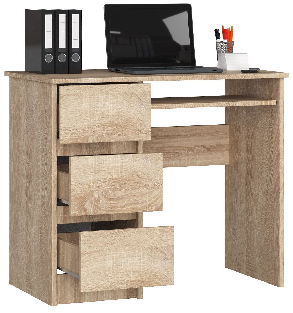 Balos íróasztal sonoma tölgy színben, három fiókkal és billentyűzettartó polccal. .. többet