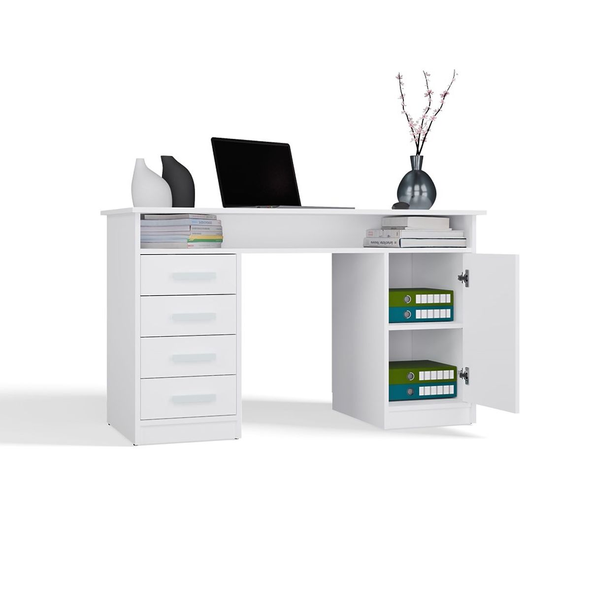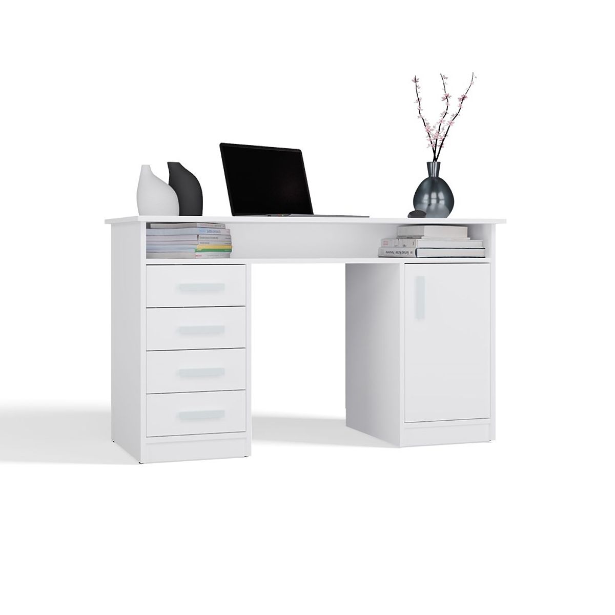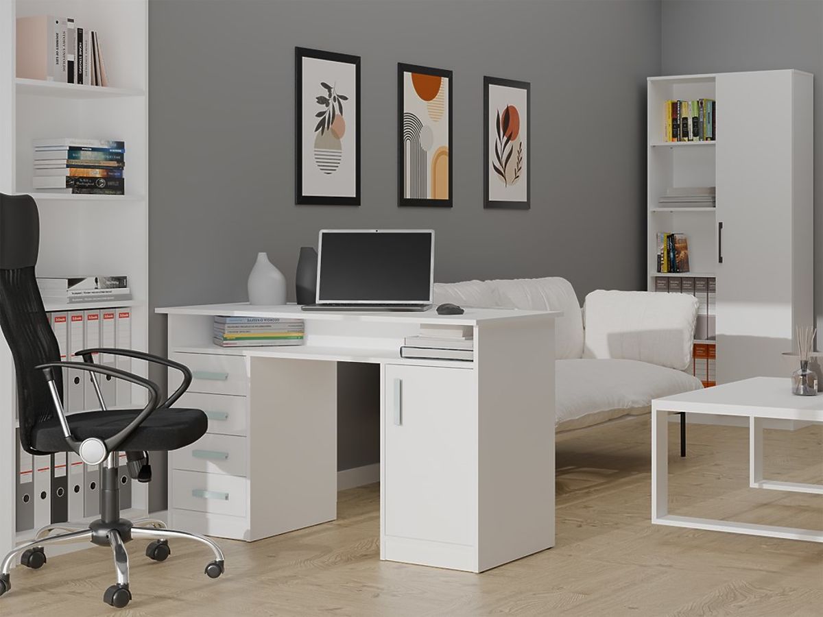 ADA ÍRÓASZTAL FEHÉR 125 cm 4 Fiók Szekrény Polcok Irodába Szobába Laptophoz