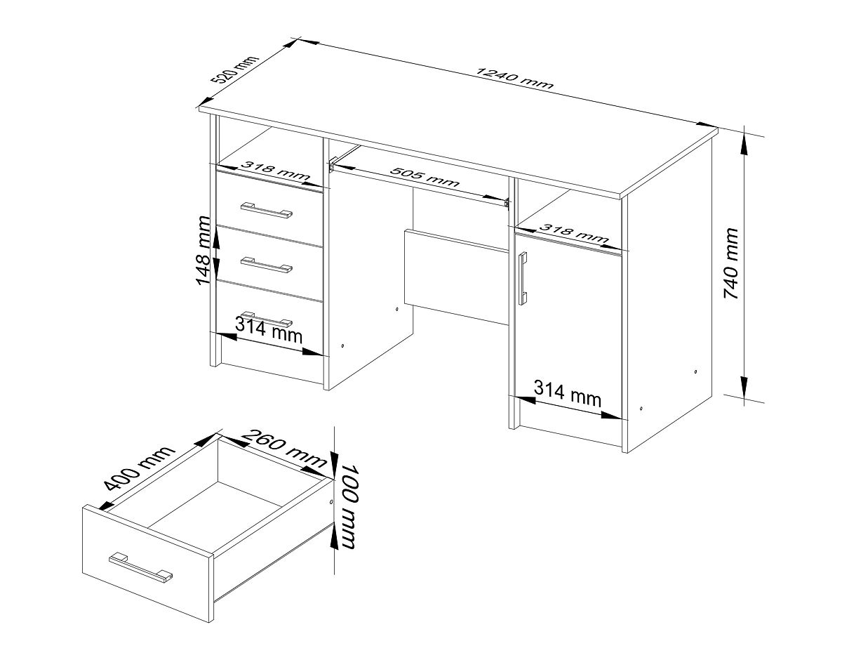Kopásálló laminált lapból készült. A lap, az oldalak és az előlapok ABS éllel vannak ellátva. Kihúzható billentyűzettartó polccal, 3 fiókkal és laminált lapból készült ajtókkal rendelkezik.