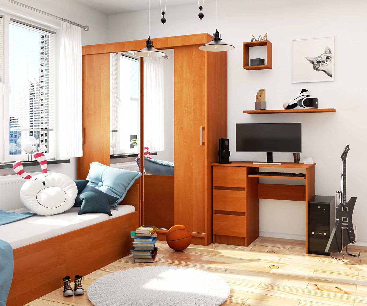 A bemutatott íróasztal kiváló minőségű égerfából és kopásálló laminált lapból készült. Összeszerelésre szánt, a mellékelt útmutató egyszerűen és részletesen magyarázza el az összeszerelést. Az íróasztal rendkívül kényelmes a használatra, és biztosítja a kényelmet munka vagy tanulás közben. Sok helyet kínál a rendezéshez, azaz három fiókot és egy kihúzható polcot, amelyre a számítógép billentyűzete helyezhető - fém görgős vezetőkön mozognak, ami biztosítja a könnyű és sima működést. A fiókok előlapjai laminált lapból készültek. A látható élek ABS éllel vannak ellátva, ami biztosítja a magas sérülésállóságot.
