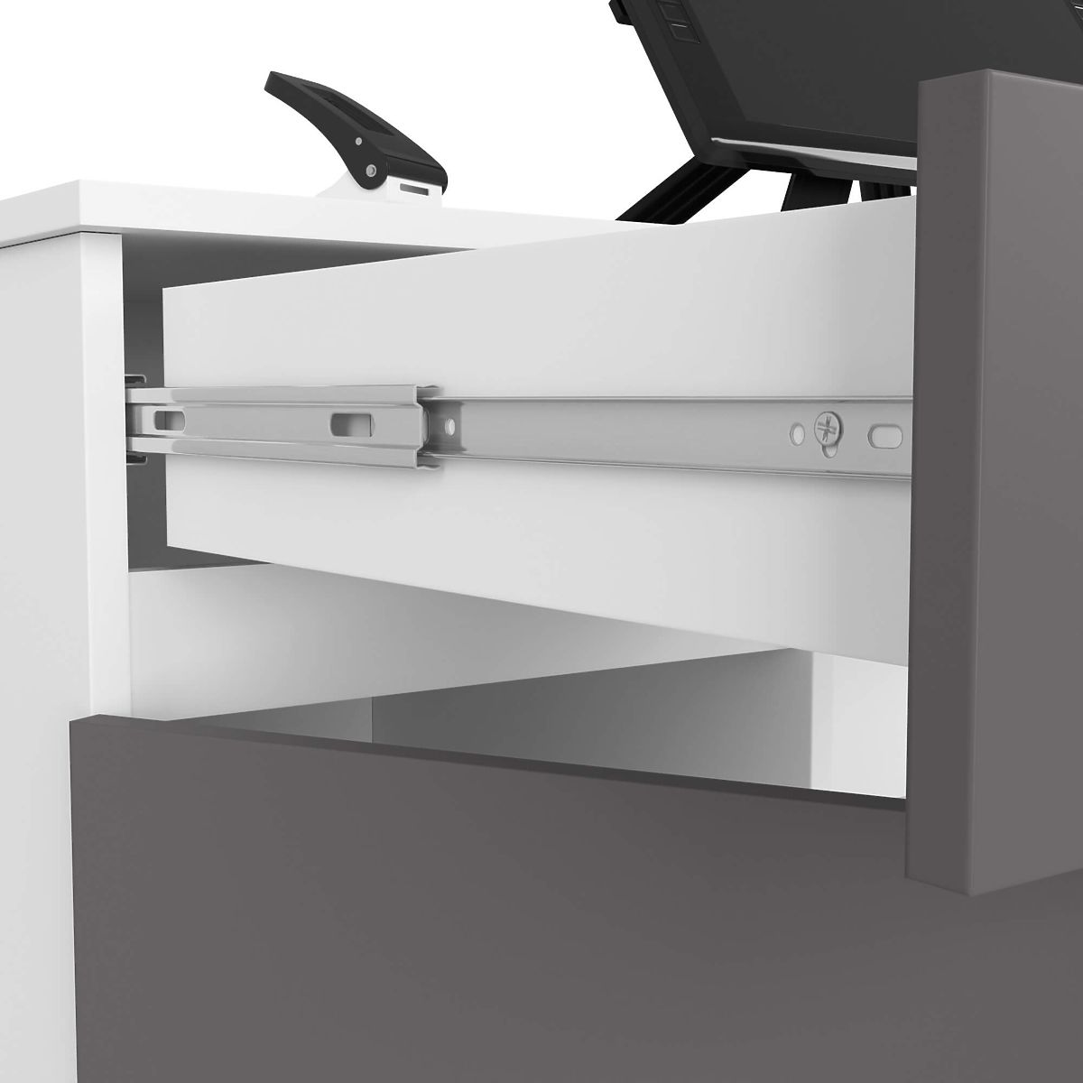 - Fiókok és billentyűzettartó polc fém golyóscsapágyas síneken mozognak
