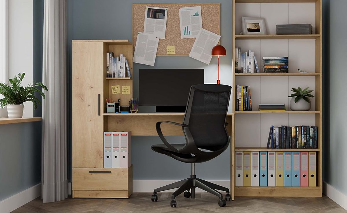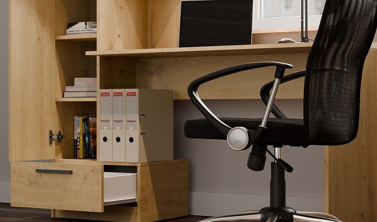 Az integrált polc ajtóval zárható részt tartalmaz, ahol három tágas polc található, valamint egy fiókot és nyitott polcokat, így könnyedén rendszerezheti az összes szükséges dolgot – a könyvektől és dokumentumoktól kezdve az apróságokig.