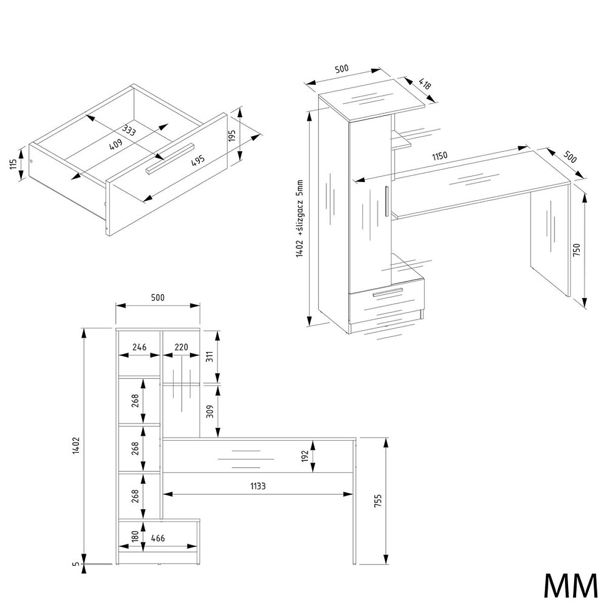 A COSMO íróasztal praktikus és kompakt megoldás azok számára, akik kényelmes helyet keresnek munkához vagy tanuláshoz, amely egyúttal funkcionális tárolóhelyet is biztosít. A bútor kiválóan alkalmas diákok szobájába, otthoni irodába vagy dolgozószobába.
