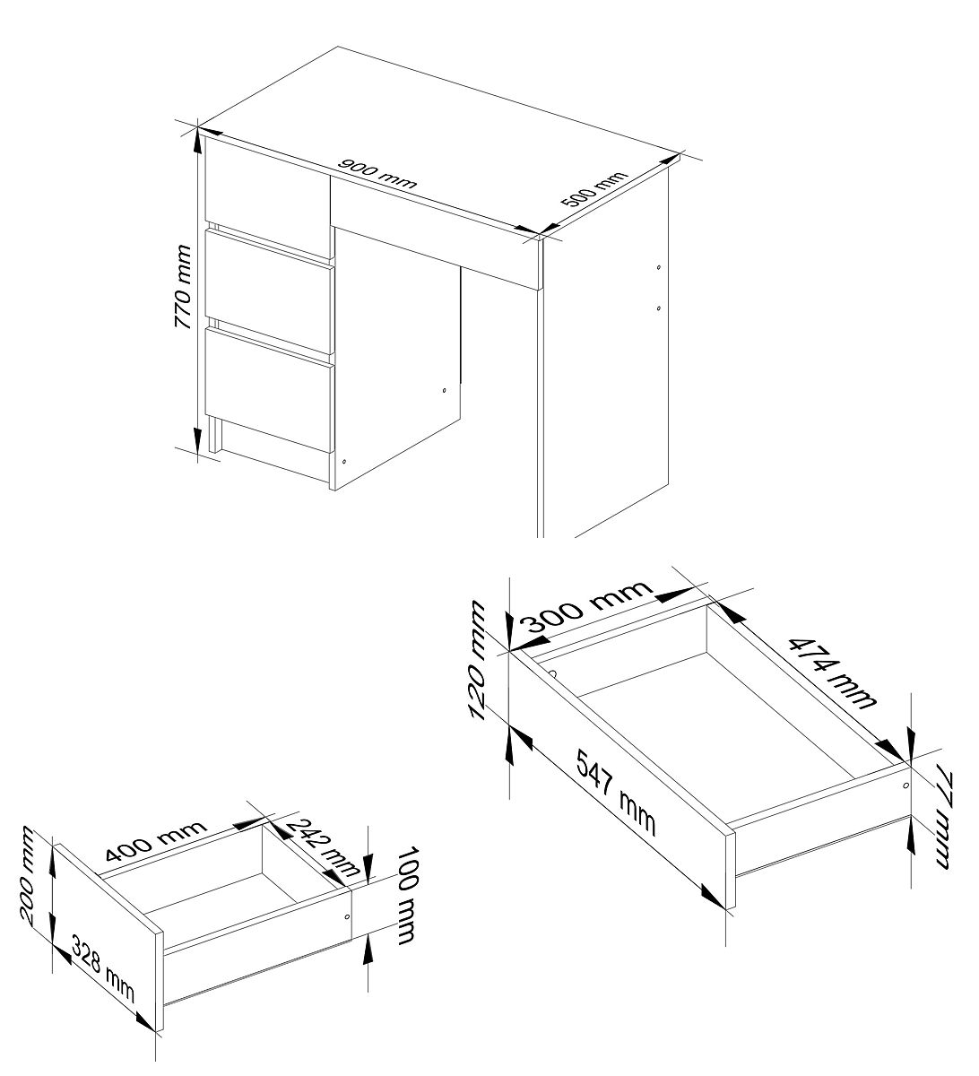 Az asztal hossza 90 cm, magassága 77 cm, mélysége 50 cm. 16 mm vastag laminált lapból készült, amely magas kopásállósággal rendelkezik. Ezenkívül van egy billentyűzettartó polca, amely a fiókokhoz hasonlóan fém golyóscsapágyakon mozog. Ez sima mozgást biztosít kihúzáskor, szükség esetén a fiók könnyen kivehető. Az asztal élei ABS éllel vannak borítva, amely megvédi a mechanikai sérülésektől és további karcolásoktól.