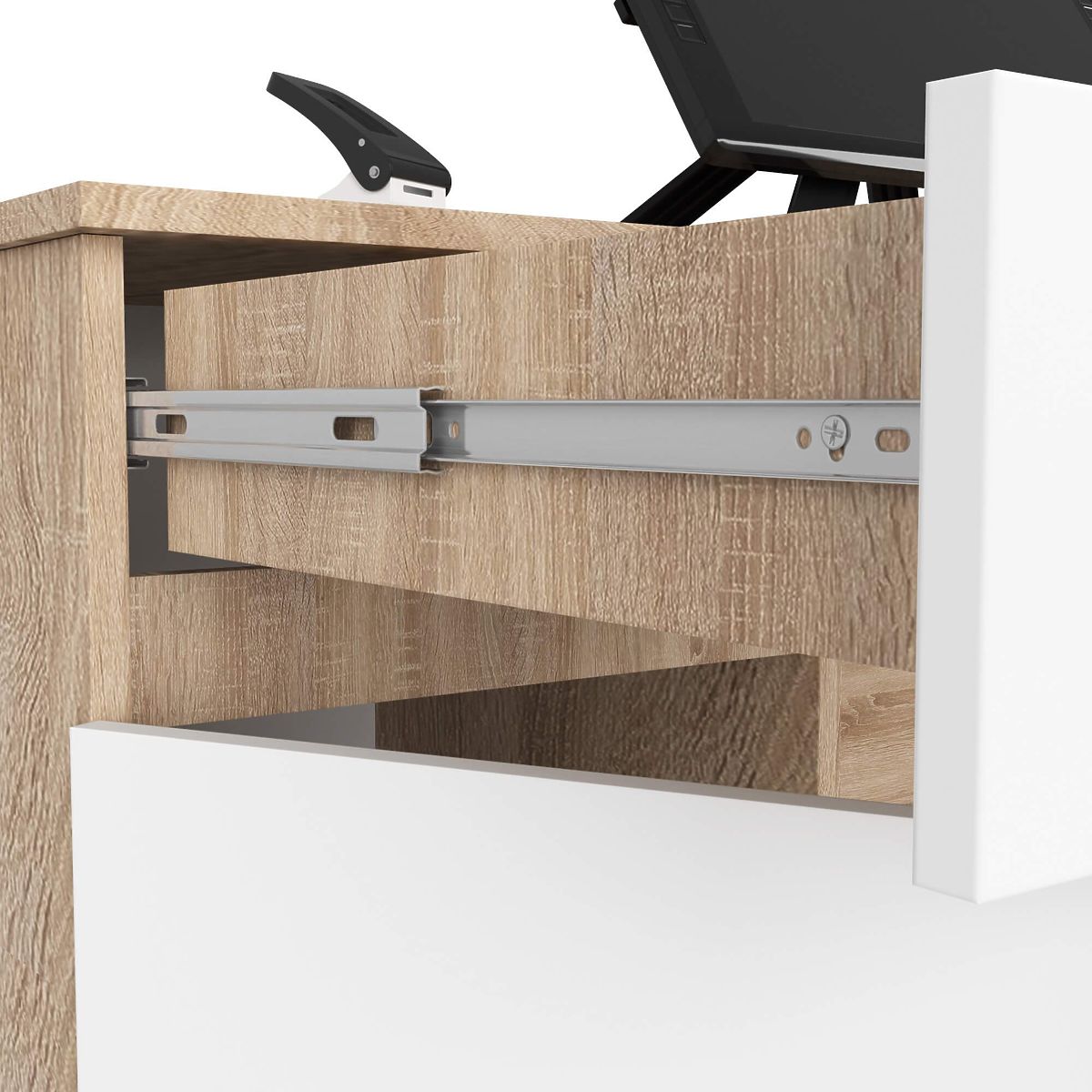 A 135 centiméter hosszú A5 számítógépasztal, amely két divatos színt (sonoma tölgy és fehér) kombinál, irodák, otthoni dolgozószobák, gyerek- vagy diákszobák berendezésére készült.