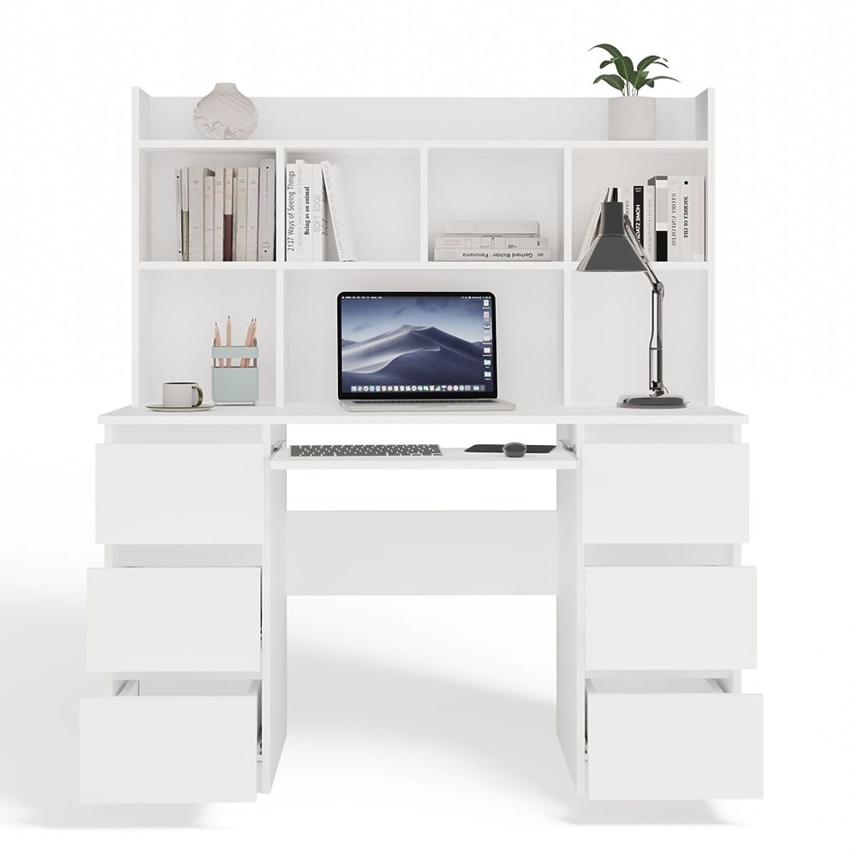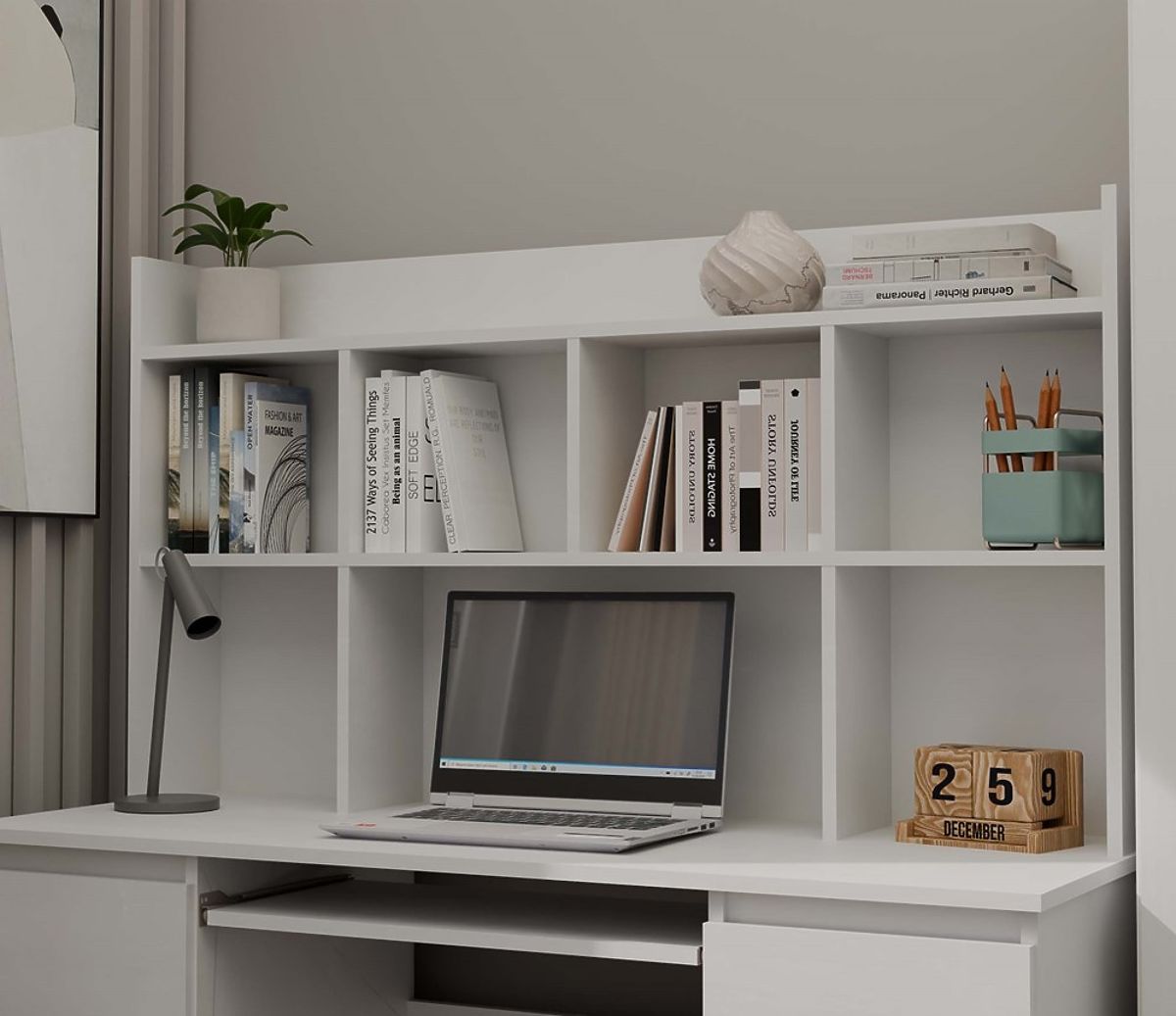 Felépítmény 5 polccal – lehetővé teszi könyvek, dekorációk tárolását és a munkaterület szervezését