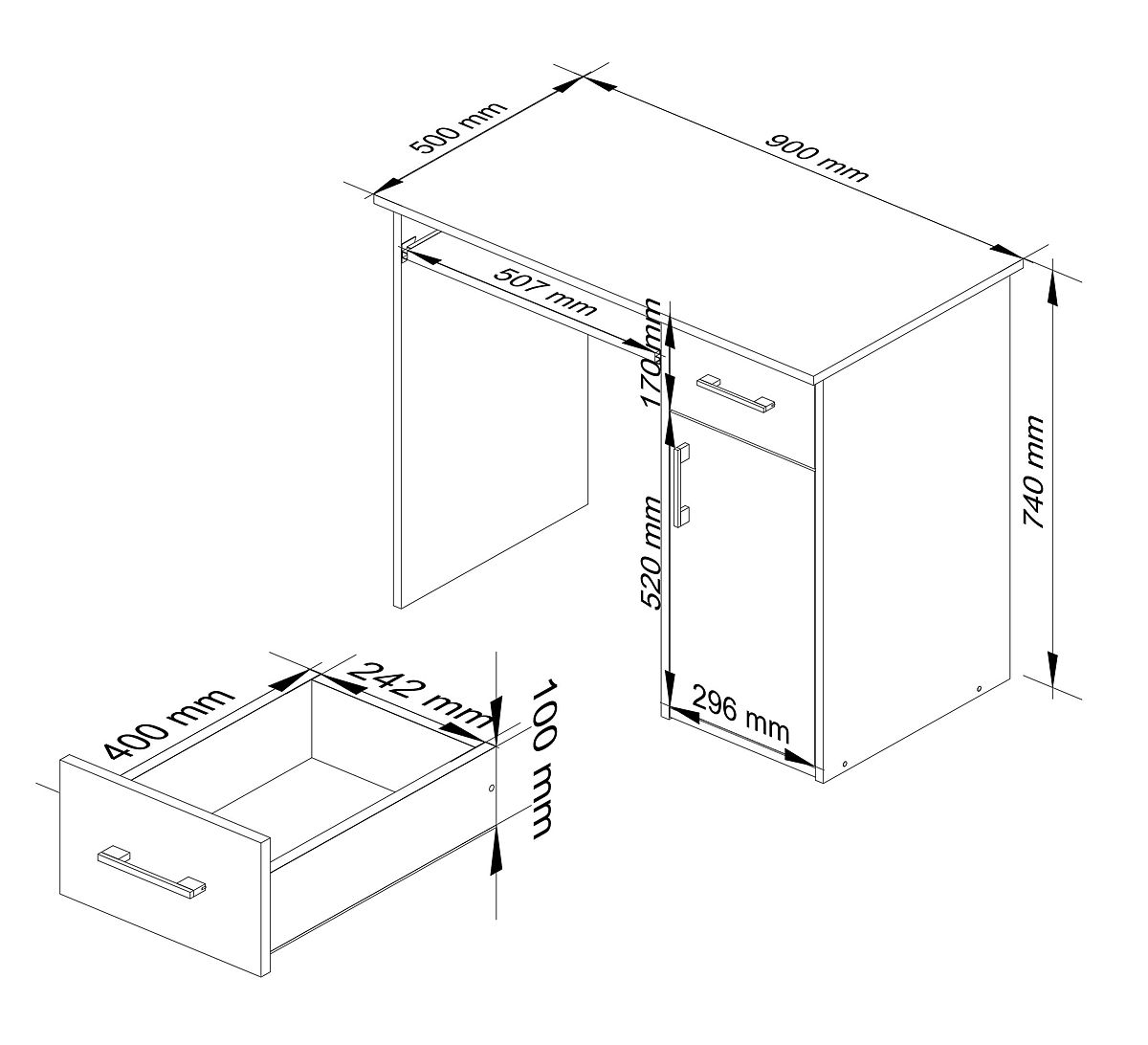 A klasszikus és modern stílus legjobb kombinációja - így lehet leírni a 90 centiméter hosszú PIN számítógépasztalt. Ideális választás kisebb helyiségekbe, ahol szükség van egy számítógépes munkasarok kialakítására. A bútor 16 mm vastag, kopásálló és tartós laminált lapból készült. Az asztal látható élei ABS szegéllyel vannak ellátva, amely fokozott ellenállást biztosít a sérülésekkel szemben. Az asztal hátulja laminált lappal van felszerelve, ami lehetővé teszi a szabad elhelyezést a szobában vagy irodában. Az asztal méretei: 90 cm x 74 cm x 50 cm. A termék ára is figyelemre méltó, amely funkcionalitással és univerzális megjelenéssel rendelkezik. Az asztal egy lapból, fiókból, szekrényből és egy kihúzható billentyűzettartó polcból áll. A bemutatott ajánlat elismerést nyer mind a klasszikus belső terek kedvelői, mind a modern elrendezések hívei körében.