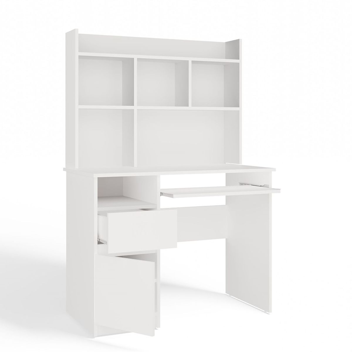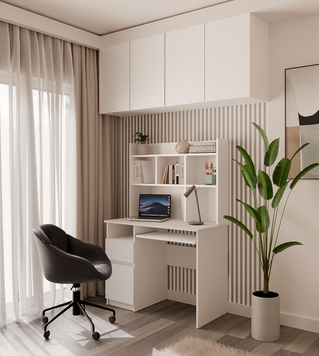 A modern forma, a matt fehér szín és a praktikus tárolási elrendezés miatt a bútor tökéletesen illeszkedik mind a fiatalok, mind a gyerekek szobájába, valamint az otthoni irodába.