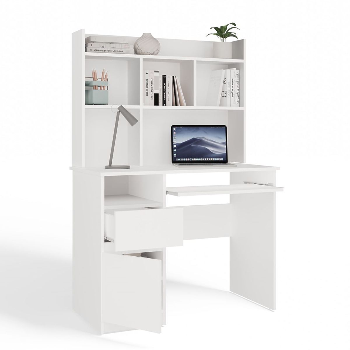 PORTO Balos Íróasztal Felépítménnyel Matt Fehér Fiók Polcok Irodába Szobába