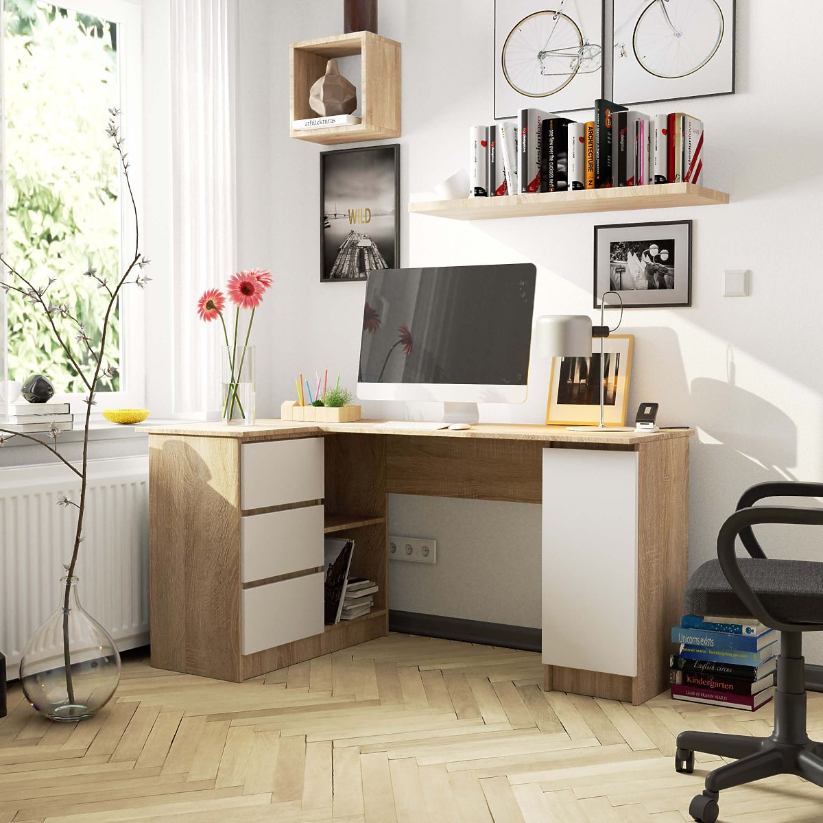 Sarok számítógépasztal fiókokkal és szekrénnyel - B20 - sonoma tölgy fehér előlappal