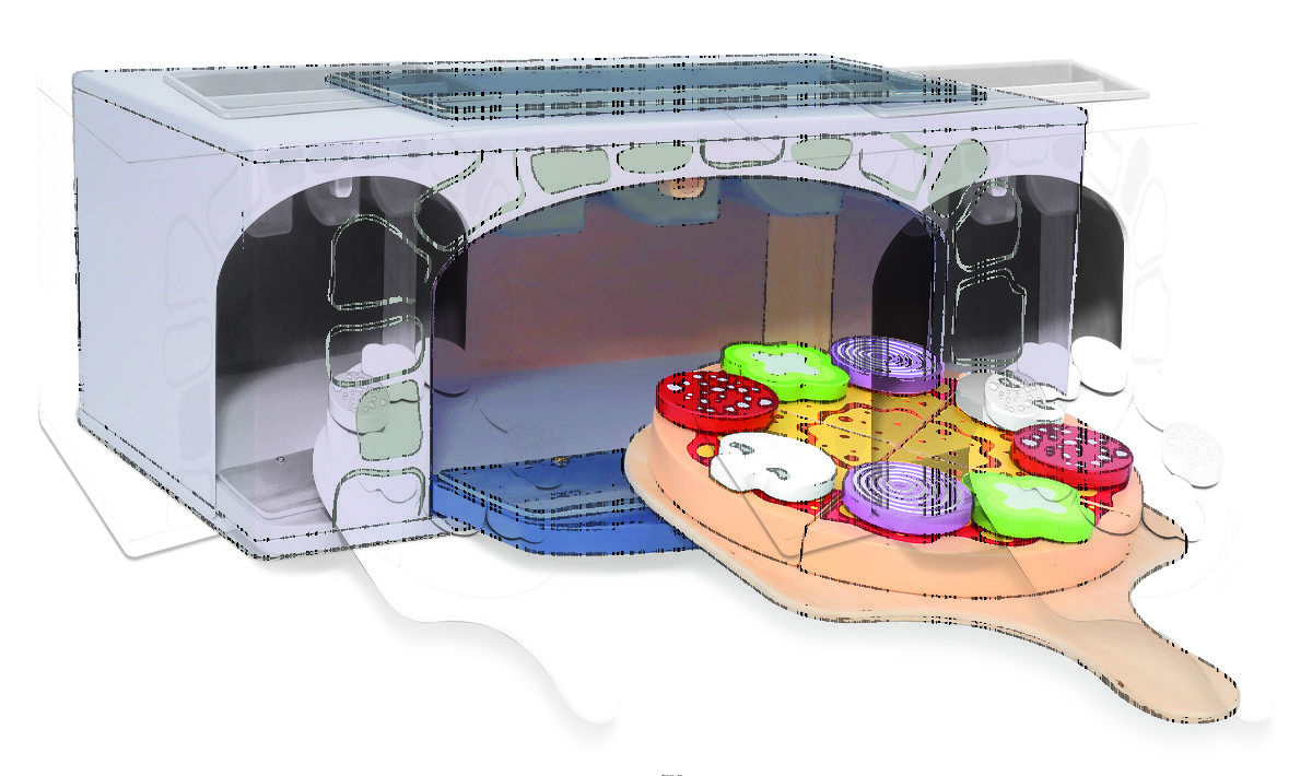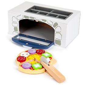 A fából készült sütő nyitott ajtóval rendelkezik, felül pedig különféle kiegészítők találhatók. A készlet 8 fa hozzávalót tartalmaz: gomba, szalámi, hagyma és saláta. A pizzatésztát 4 darabra lehet vágni. A készlet tartalmaz egy tálcát és egy pizzaszeletelőt is.