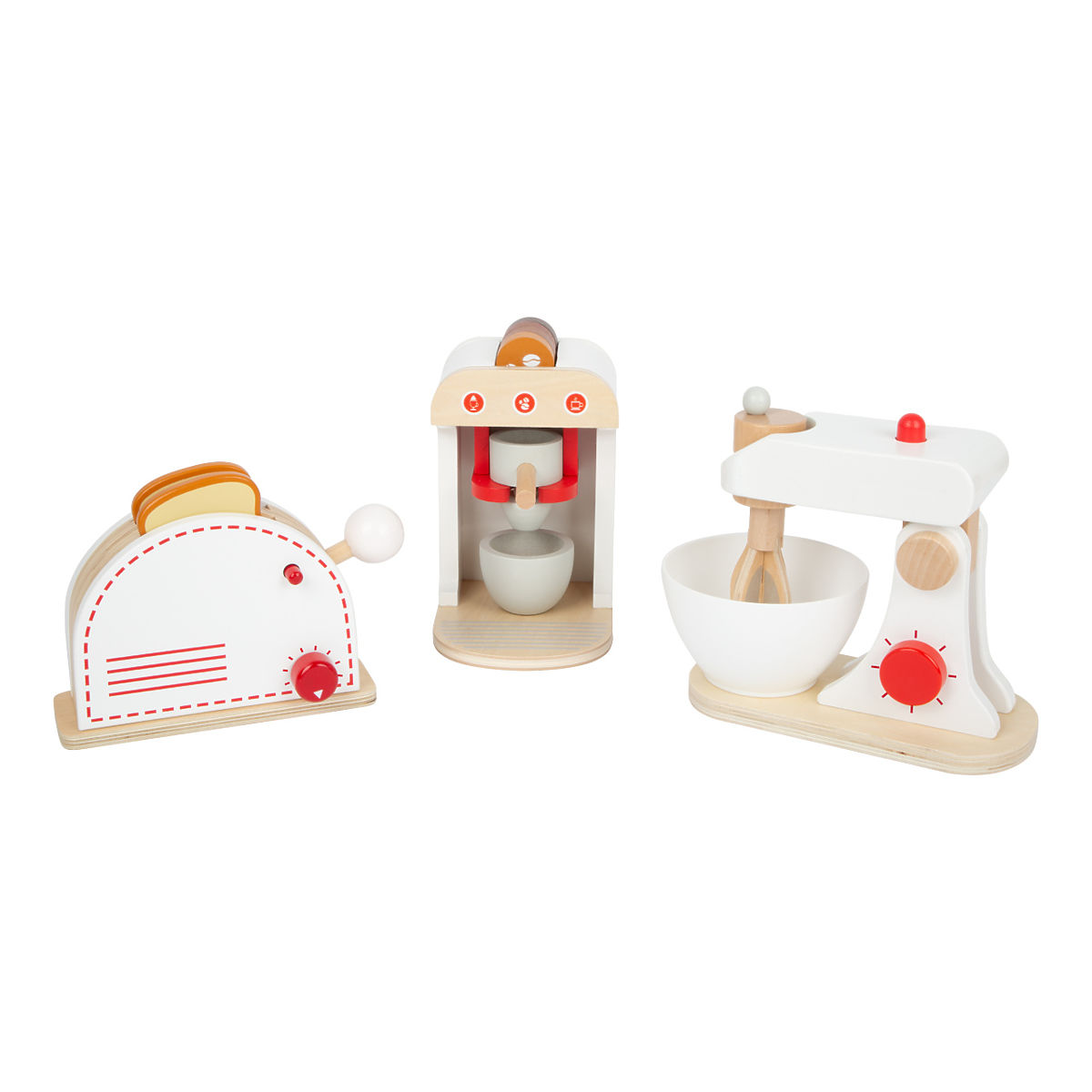 Teljes konyhai készülék szett! Ez a készlet tartalmaz egy kenyérpirítót, kávéfőzőt és turmixgépet, így mindent, amire egy igazi konyhának szüksége van. A fából készült készülékek szerepjátékra ösztönzik a gyerekeket, és nagyon valósághűek. Kattogó tárcsákkal rendelkeznek, a kenyérpirítón pedig van egy kar, amellyel „kilőhetjük” a pirított kenyereket, a turmixgép habverője forog. A kávéfőző különböző erősségű kávészemekkel rendelkezik, így eszpresszót, cappuccinót vagy lattét készíthetünk. Főbb jellemzők: turmixgép tálal, kenyérpirító 2 pirítóssal, kávéfőző karral és 4 kapszulával, csésze funkcionális, kivehető és mozgatható alkatrészekkel, kattogó forgó gombokkal, masszív és tartós fa kivitelben.