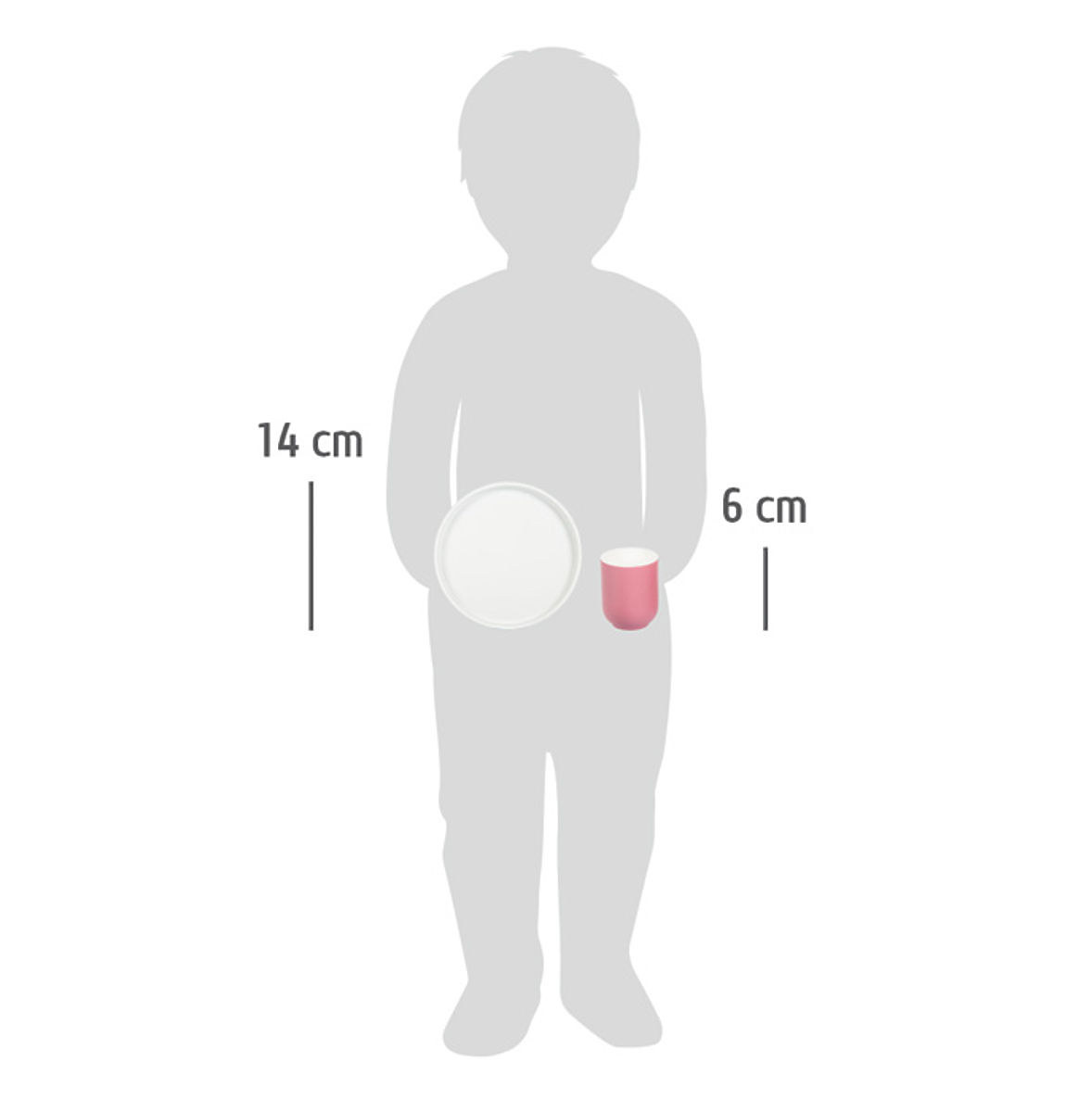 Modern edénykészlet, amely tartalmaz tányérokat, csészéket, evőeszközöket és terítéket két személy számára. Kiváló minőségű, masszív és tartós fából készült, amely hosszú élettartamot biztosít. Nyomtatott terítékkel további tanulási lehetőségeket kínál, amely megmutatja, hogyan kell helyesen megteríteni az asztalt. Modern megjelenés lineáris formákkal és a természetes fa kombinációjával, trendi füstkék és bogyópiros színekkel. Tökéletes színharmónia és design a Tasty kollekcióval, ahol gyerekkonyhát és további konyhai termékeket találhat. Különösen valósághű szórakozást nyújt szerepjátékhoz a gyerekkonyhában. Támogatja a finommotoros készségek, szociális képességek és egyéb mindennapi készségek fejlődését. Kiegyensúlyozott designjának és modern színvilágának köszönhetően különösen jól illeszkedik a modern gyerekszobába és nappaliba. Főbb jellemzők: Támogatja a finommotoros és szociális képességek fejlődését 12 részes készlet