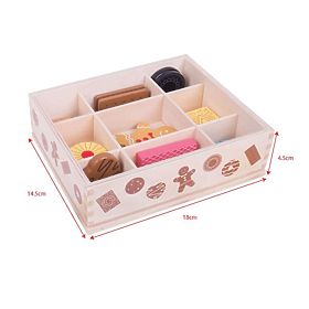 Ez a fából készült sütisdoboz tele van finom kinézetű fa finomságokkal. Sokféle süteményt tartalmaz, amelyeket mindenki szeret, beleértve a mézeskalácsokat, édességeket stb. Kezdődjön a délutáni teázás. Ez a nagyszerű édességdoboz egy olyan eszköz, amely segít a kicsinek többet megtudni az egészséges és kiegyensúlyozott étrend fontosságáról, arról, honnan származik az ételünk, és hogyan készítjük el ételeinket. Főbb jellemzők: a kekszek szépen elrendezhetők egy sima fadobozban a könnyű tárolás érdekében, minőségi anyagokból készült, amelyek megfelelnek a jelenlegi európai biztonsági előírásoknak