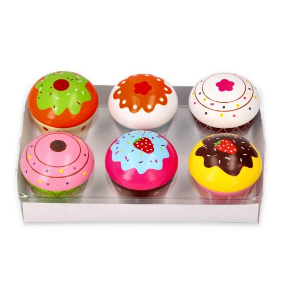 A fából készült muffinok mindegyike más és más. Különböznek mind az alsó részben, mind a jegesedésben és a díszítésben. A süteményeket bogyók, virágok és színes golyók díszítik.