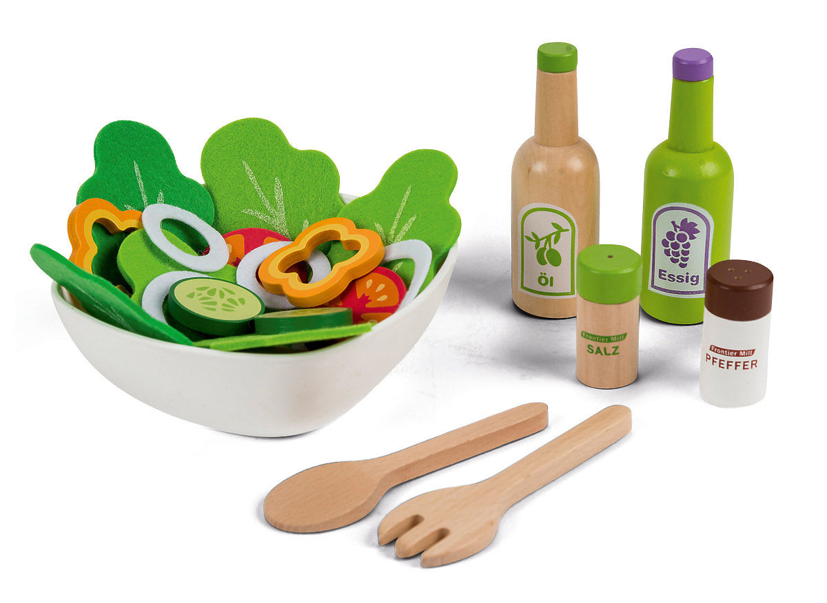 A fából készült salátakészlet nagyszerű játék azoknak a gyerekeknek, akik szeretnek a konyhában dolgozni. Lehetővé teszi a képzelet fejlesztését , megtanít egészségesen táplálkozni és ételt készíteni . A játék fejleszti a gyermek kreativitását és kézügyességét, miközben sok szórakozást nyújt.