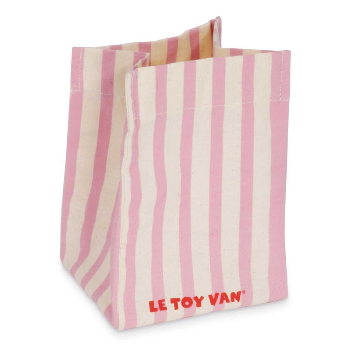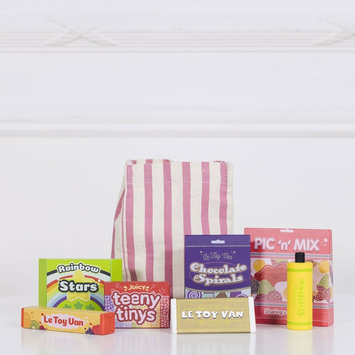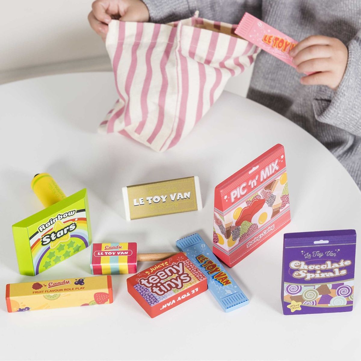 Ez a játék nosztalgiát hozhat néhányunknak. A csíkos retro édességzsák sok édes szórakozást kínál, fogfájás nélkül. Minden édesség egyedi illusztrációval rendelkezik, némelyiken aranyszínű részletek is találhatók. Ez a játék etikusan, fenntartható gumifából készült, és 100%-ban műanyagmentes! A fa édességek a gyerekeket a képzelet varázslatos világába vezetik. Célzott játékok: Minden Le Toy Van játék tartósra készült. Tapasztalt kézművesek szeretettel tervezték, etikus gyakorlatok és fenntartható anyagok felhasználásával, amelyek kíméletesebbek bolygónkhoz. Főbb jellemzők: etikusan készült fenntartható fából, a legszigorúbb szabványok szerint tesztelve, nem mérgező, vízbázisú festékekkel festve, kreatív és képzeletbeli játékra inspirál, segíti a beszéd és szociális készségek fejlődését, támogatja a korai fejlődést. Honeybake kollekció: A kollekció játékai felfedezésre alkalmasak, segítik a gyerekeket a képzelet, szociális és verbális készségek, valamint a kognitív funkciók fejlesztésében. A hagyományos design modern részletekkel biztosan szórakoztató lesz a gyerekek számára. A Honeybake a Le Toy Van legtöbb díjat nyert kollekciója, a design, minőség, biztonság, valamint az oktatási és játékérték miatt.
