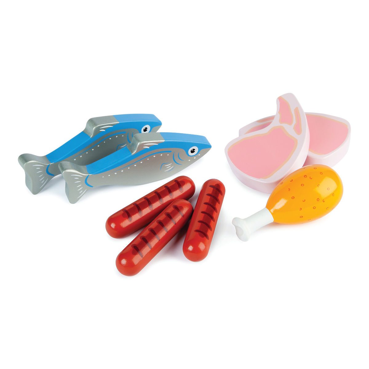 Hús és hal friss kiszállítása fogantyús fadobozban. Nagyszerű játék kereskedőknek vagy szakácsoknak, a készlet 2 halat, 2 karajt, 3 kolbászt és 1 csirkecombot tartalmaz. Nagyszerű módja annak, hogy a gyerekeket megtanítsuk az egészséges és kiegyensúlyozott étrend fontosságára, beleértve azt is, hogy honnan származik az étel és hogyan kell elkészíteni. Mindegyik darab dús és ideális a kisgyermekek kezébe. Kreatív és ötletes játékra ösztönöz. Felelős forrásból származó minőségi anyagokból készült. Megfelel az európai biztonsági szabványnak. Főbb jellemzők: ideális forma kisgyermekek kezéhez, támogatja a kreativitást és a képzelőerőt